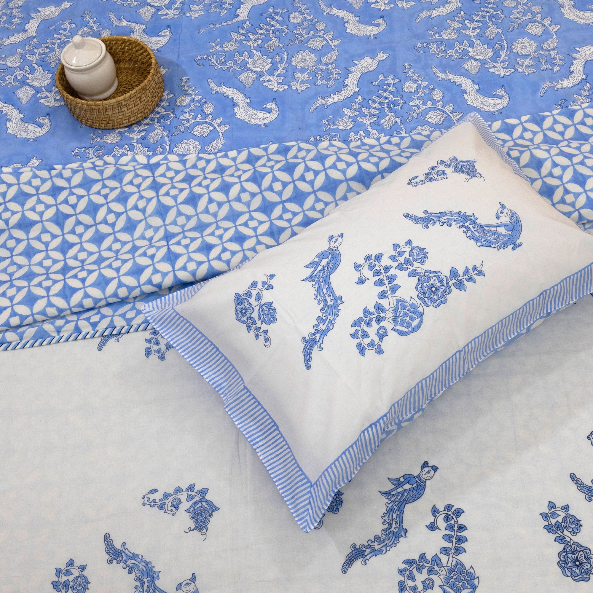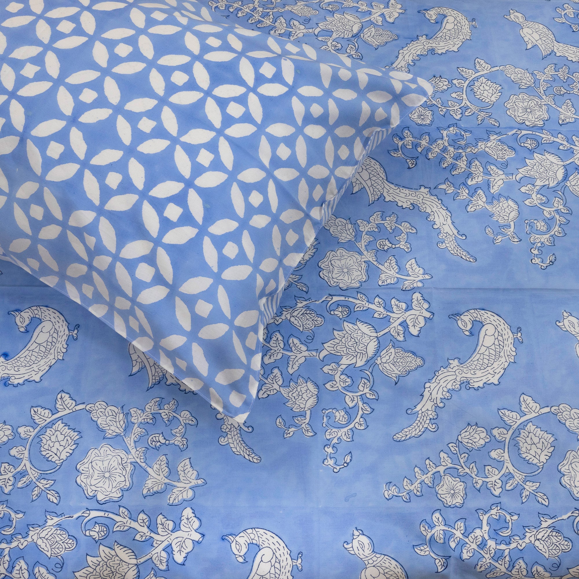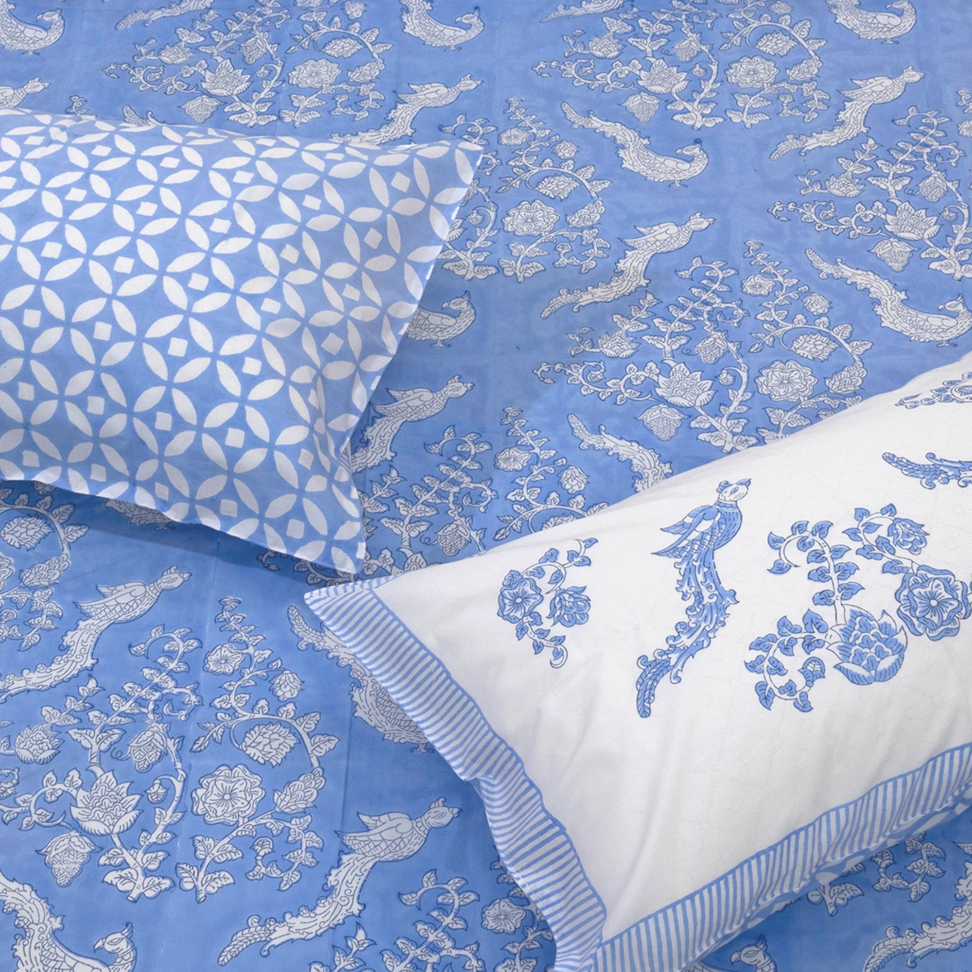 Blue Bird| 300TC Bedsheet | 2 Pillow Covers | Mulmul Cotton Dohar
