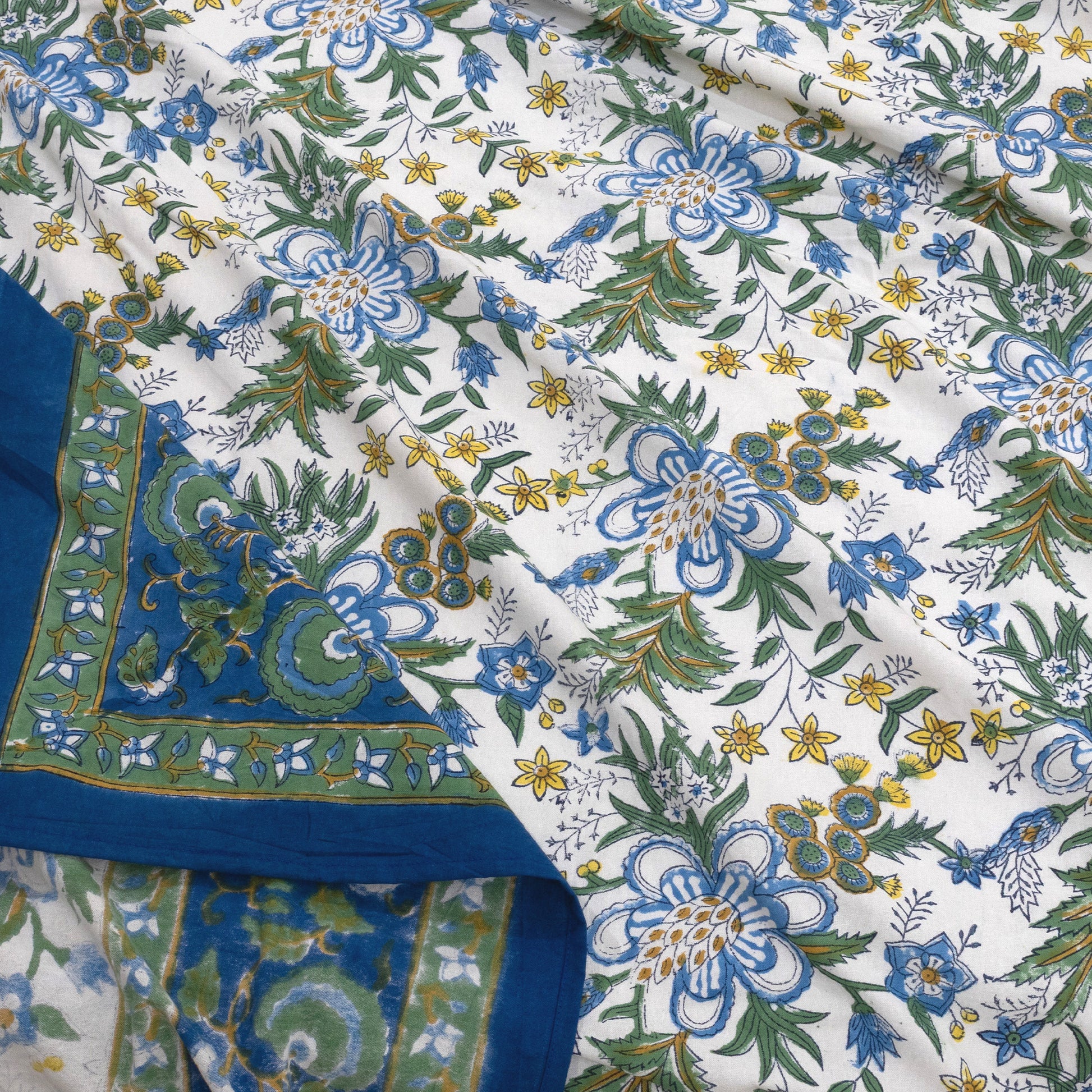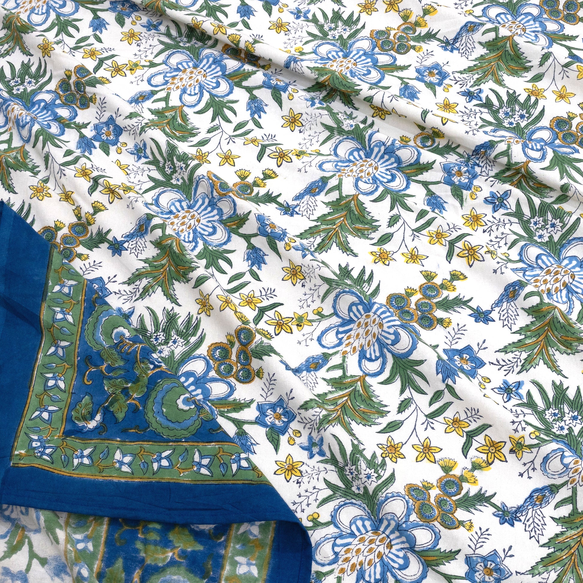 Hand Block Printed Bedsheet | Bed Spread Flat sheet Bed Sheet | Pure Cotton | Queen 90"x108" | King 108"x108" | 2 Reversible Pillow Covers | Blue Green Motives On White