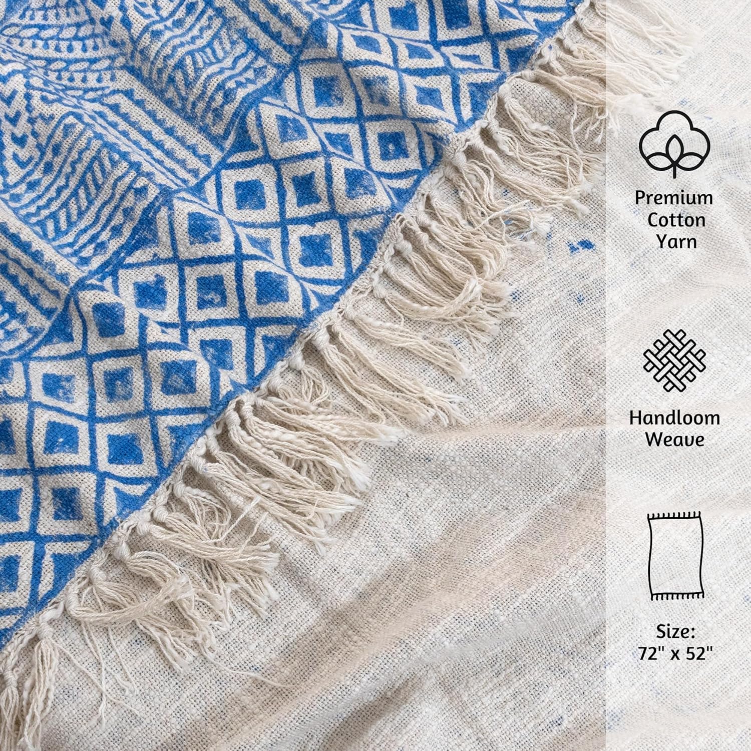 Pure Cotton Throw Blanket for Sofa Bed, Chair and Gifts | Soft Breathable Tassels All Seasons 52"x72" | Blue Tapestry