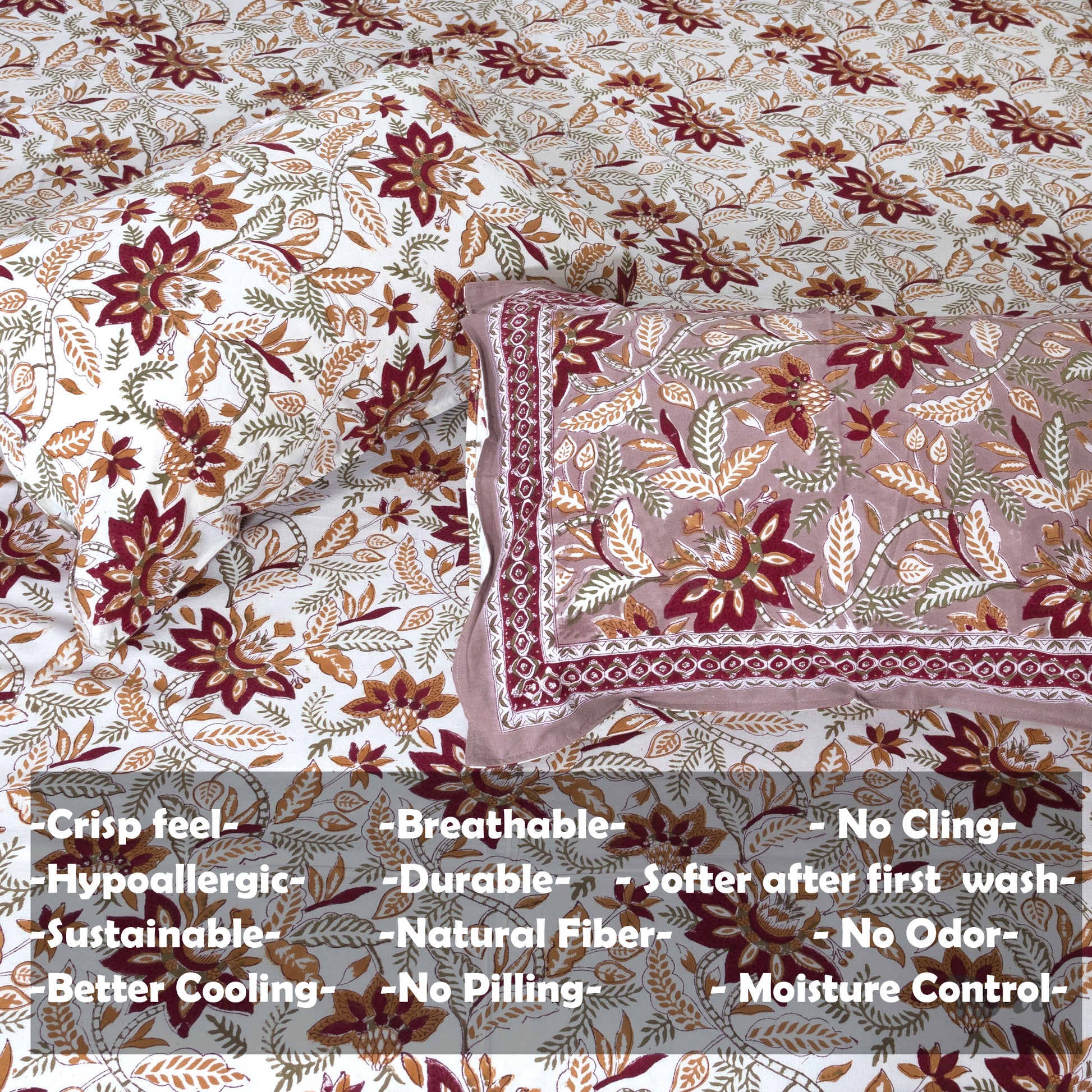 Hand Block Printed Bedsheet | Bed Spread Flatsheet Bed Sheet | Pure Cotton | Queen 90"x108" | King 108"x108" | 2 Reversible Pillow Covers |Rust Maroon florals on White