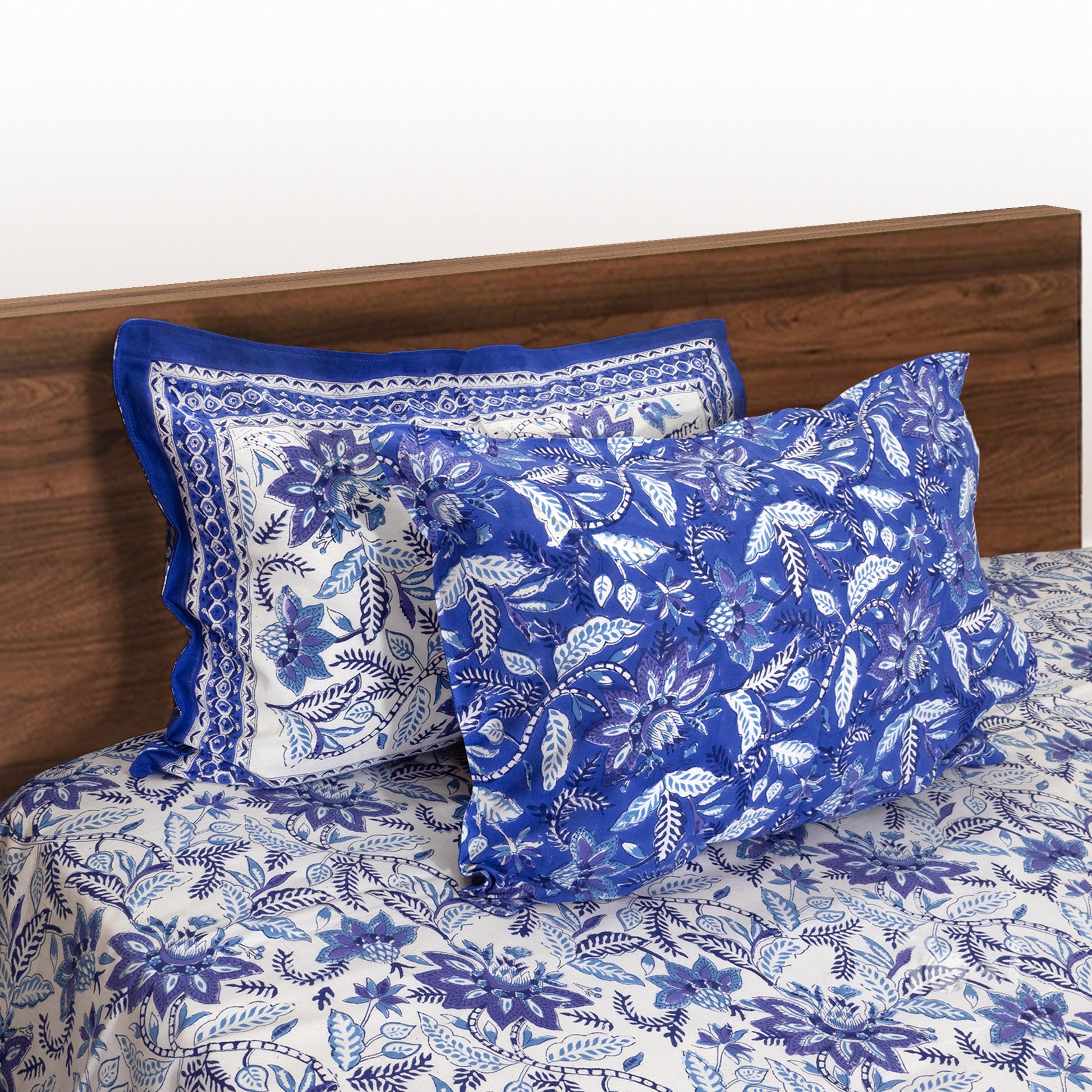Hand Block Printed Bedsheet | Bed Spread Flatsheet Bed Sheet | Pure Cotton | Queen 90"x108" | King 108"x108" | 2 Reversible Pillow Covers | Royal Blue, Purple Florals on White
