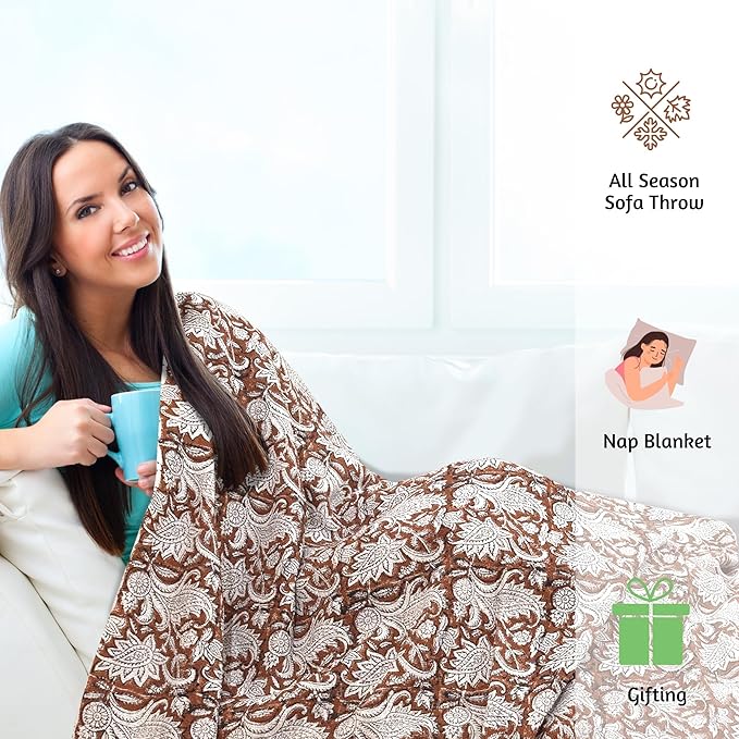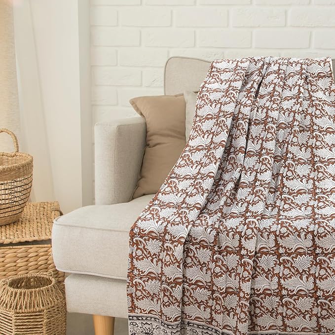 Pure Cotton Throw Blanket for Sofa Bed, Chair and Gifts | Soft Breathable Tassels All Seasons 52"x72" | Ethnic on Brown
