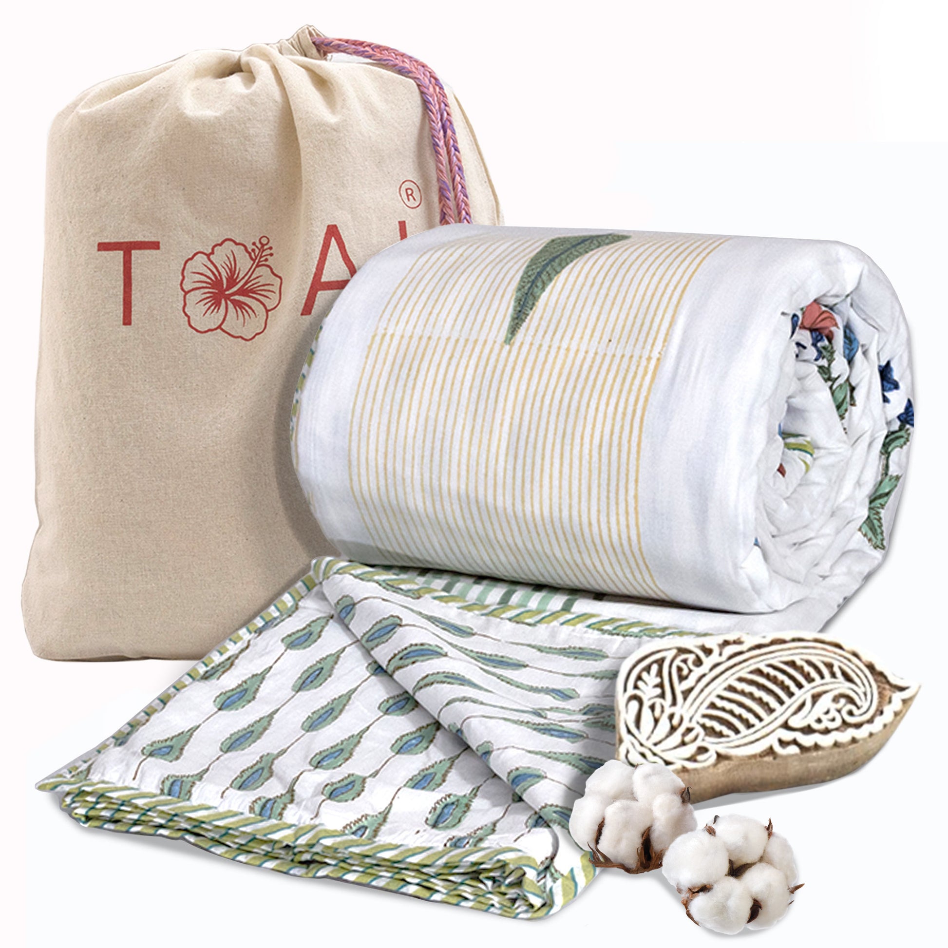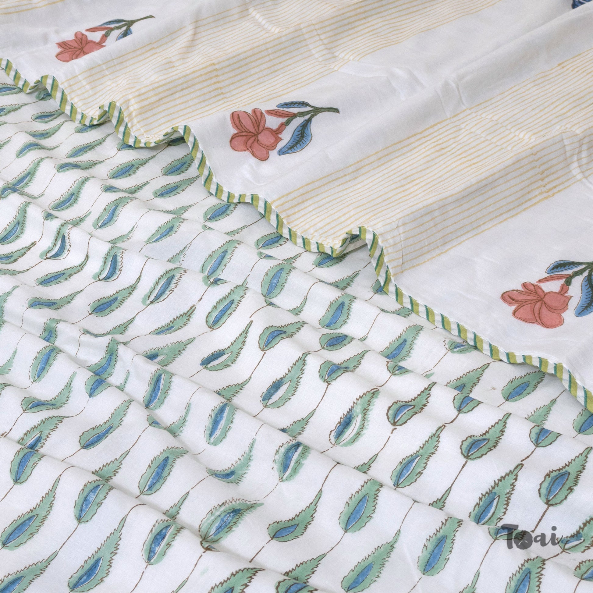 Jaipuri Dohar Hand Block Printed 3 Layers Reversible 100% Mulmul Cotton Flannel Filling | Single 60" X 90" | Queen 90"x108" | King 108"x90"(Floral Panel, White, Blue, Yellow)
