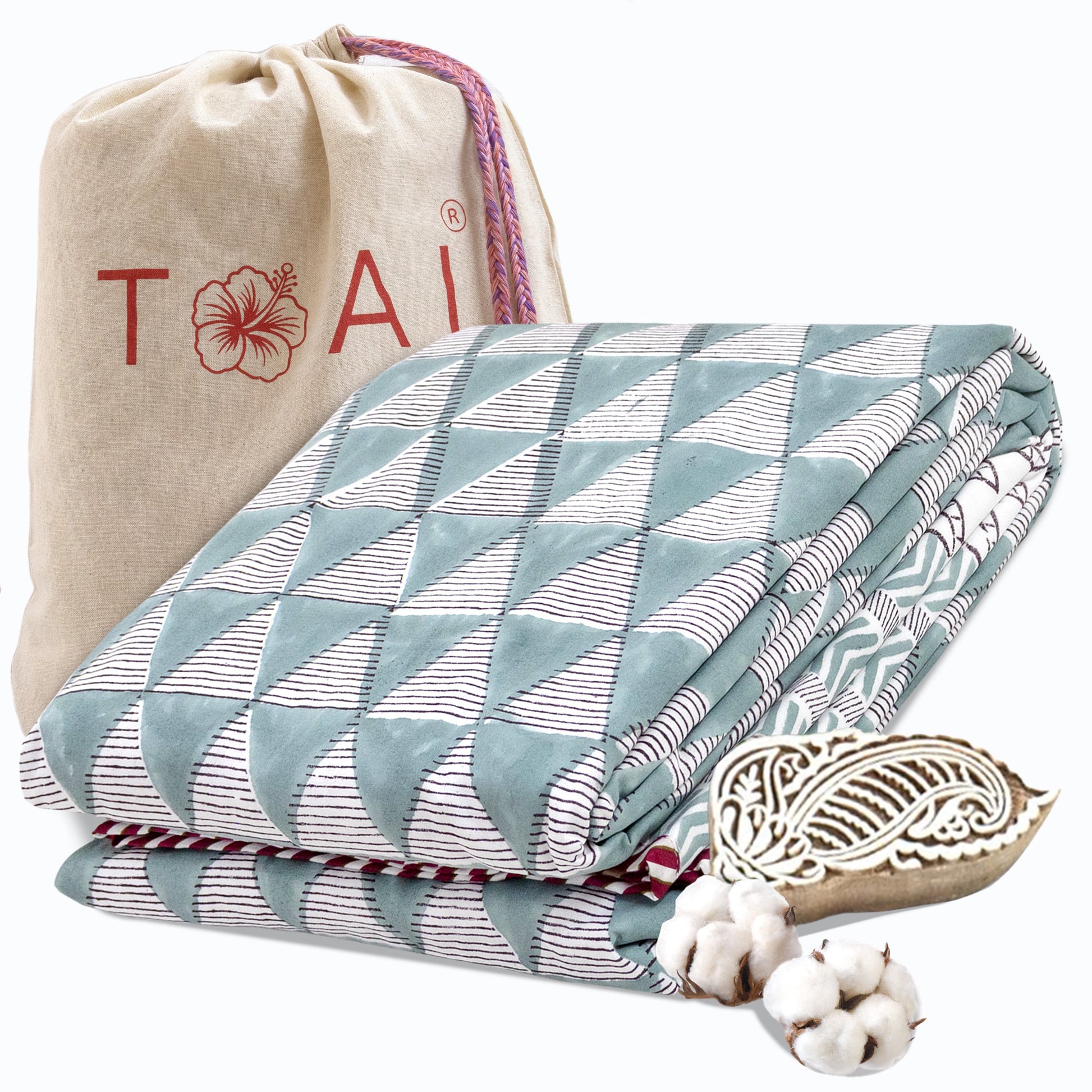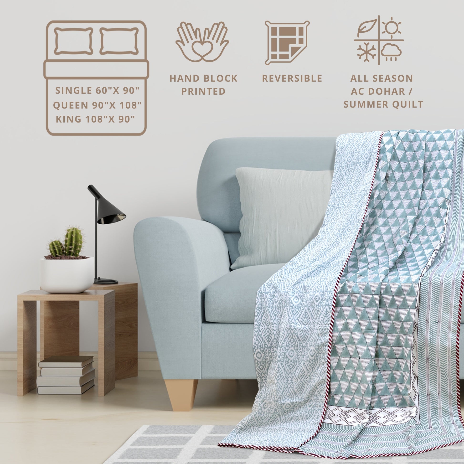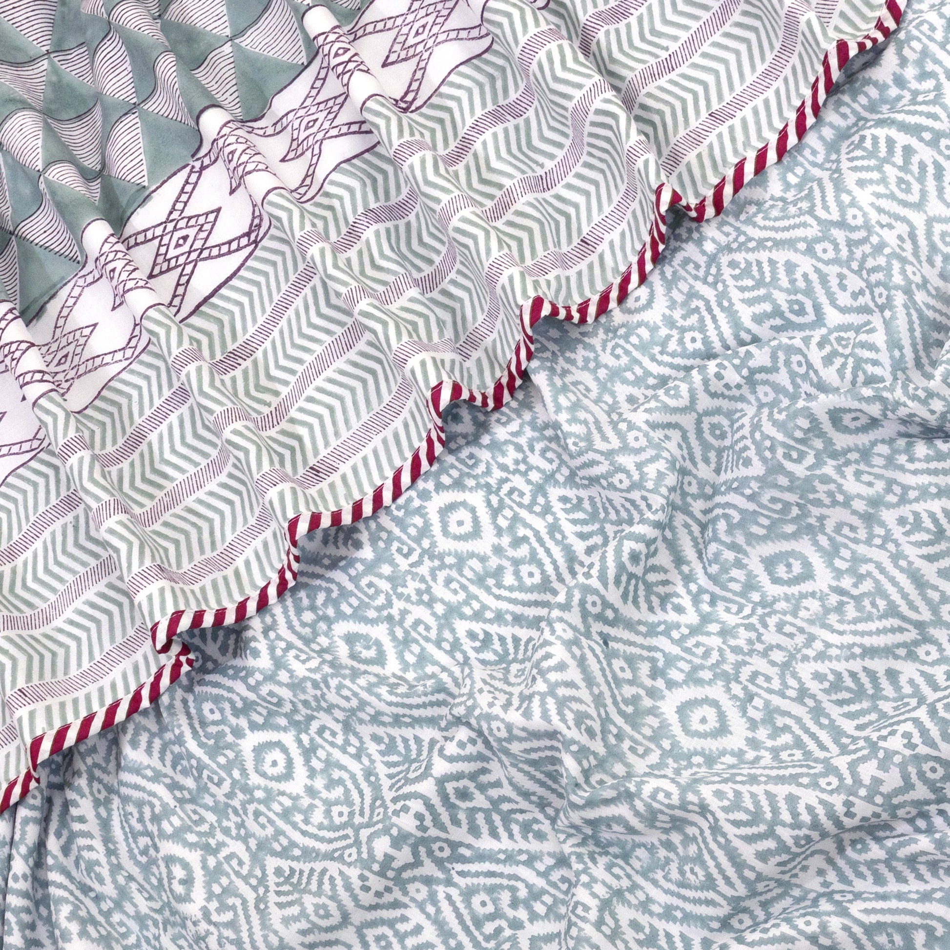 Jaipuri Dohar Hand Block Printed 3 Layers Reversible 100% Mulmul Cotton Flannel Filling | Single 60" X 90" | Queen 90"x108" | King 108"x90" (Geometric Triangles, White, Green)
