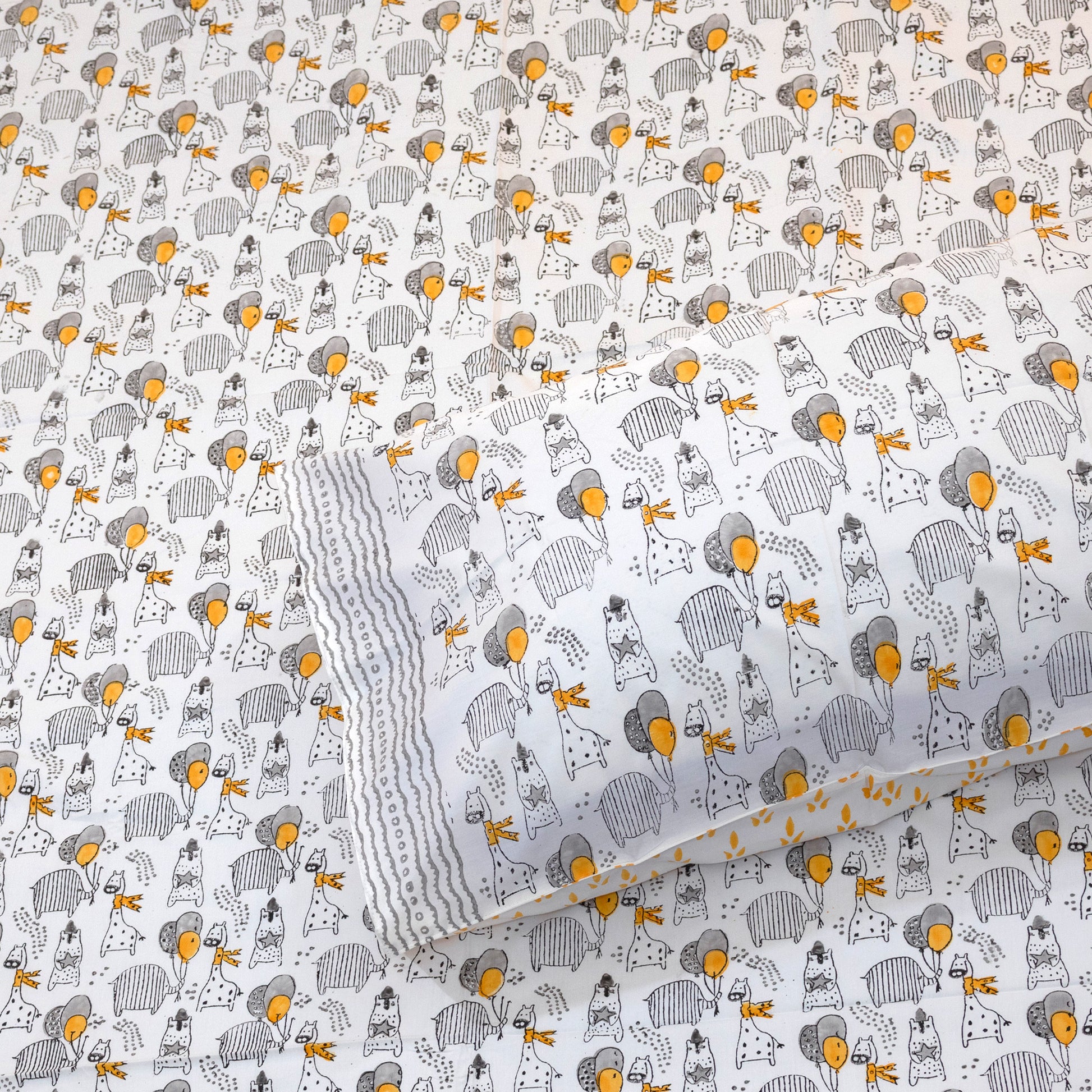 Hand Block Printed Bedsheet | Bed Spread Flat sheet Bed Sheet | Pure Cotton | King 108"x108" | Queen 90"x108" | Single 60"x90" | 300 TC Pure Cotton | 2 Reversible Pillow Covers |Grey Cartoon