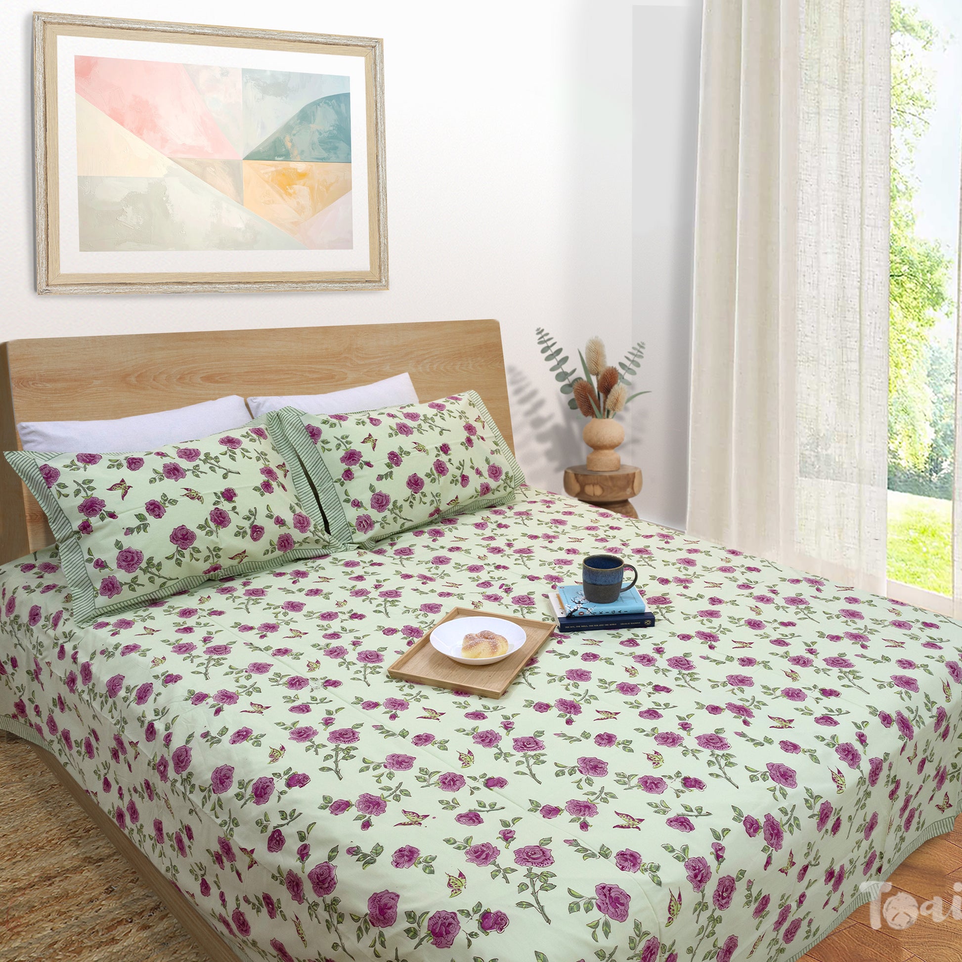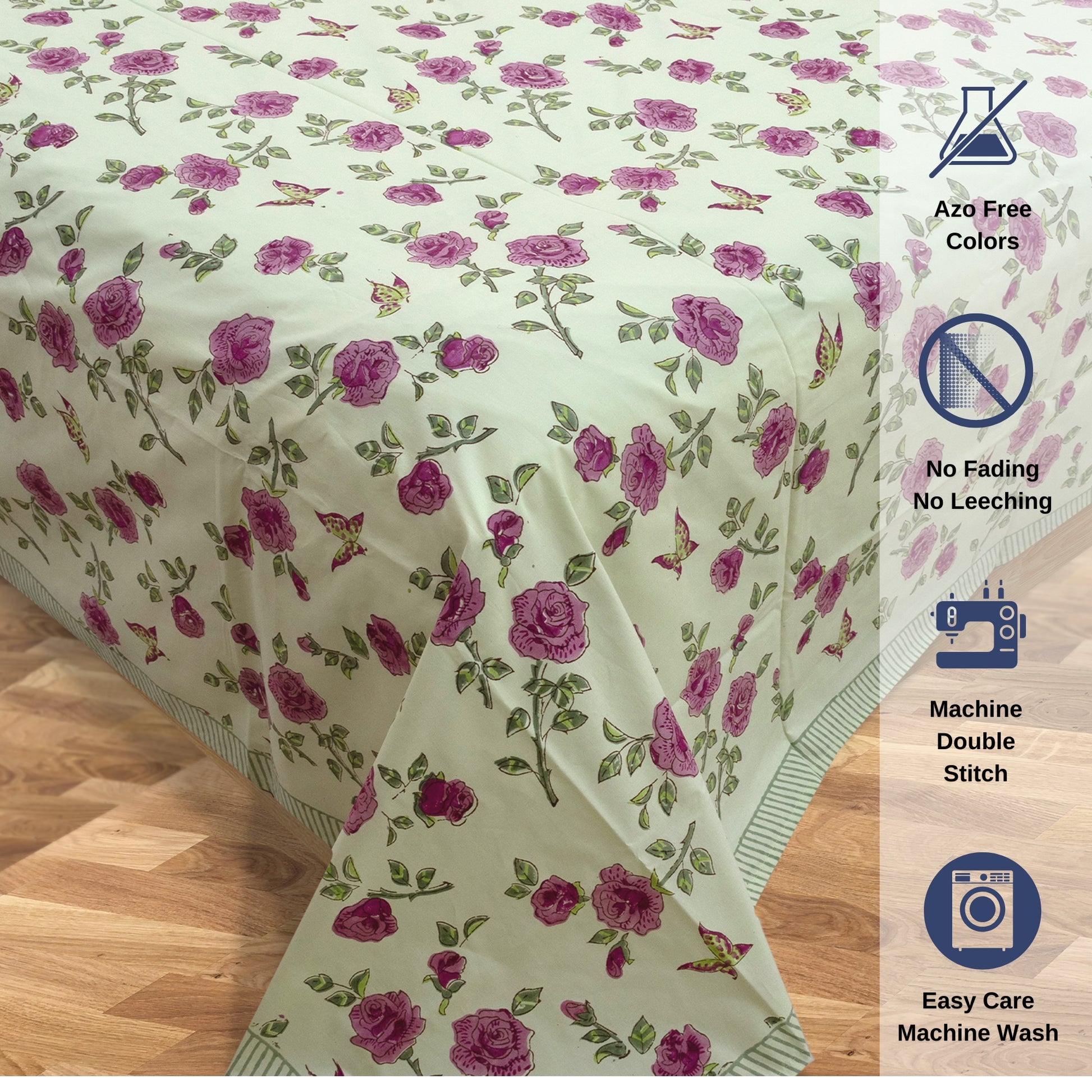 Hand Block Printed Bedsheet | Bed Spread Flat sheet Bed Sheet | Pure Cotton | King 108"x108" | Queen 90"x108" | Single 60"x90" | 300 TC Pure Cotton | 2 Reversible Pillow Covers |Rose Meadow