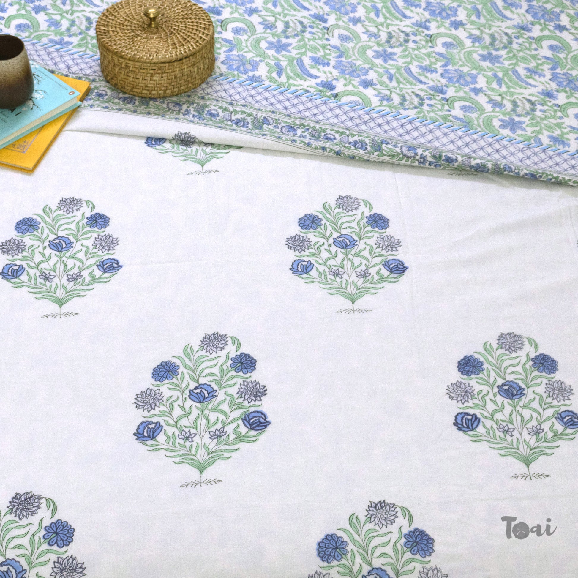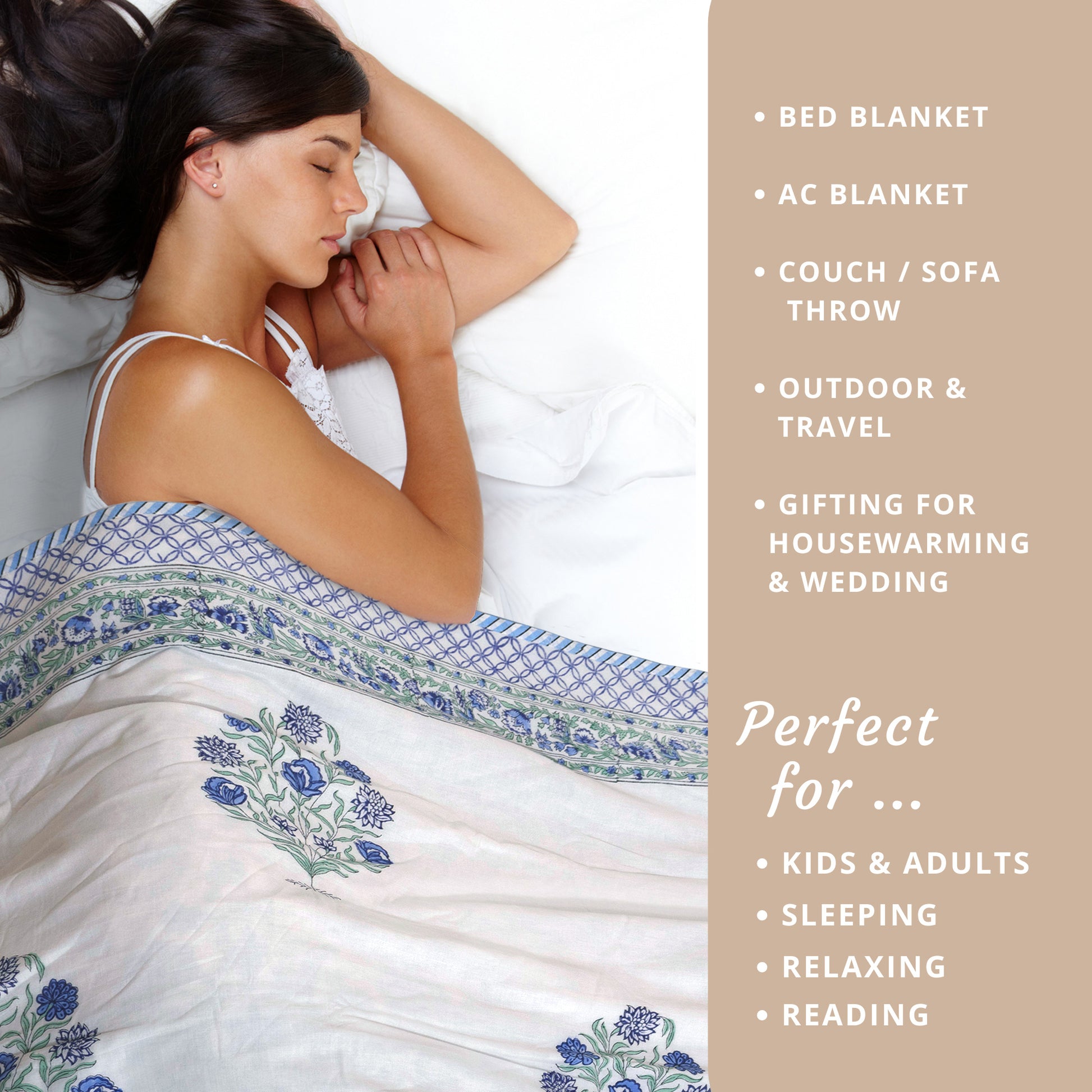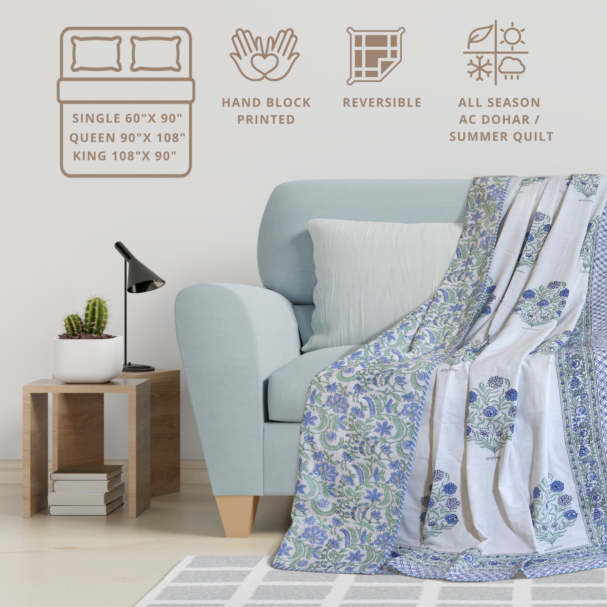 Jaipuri Dohar Hand Block Printed 3 Layers Reversible 100% Mulmul Cotton Flannel Filling | Single 60" X 90" | Queen 90"x108" | King 108"x90" (Mughal Floral, Blue, Green, White)