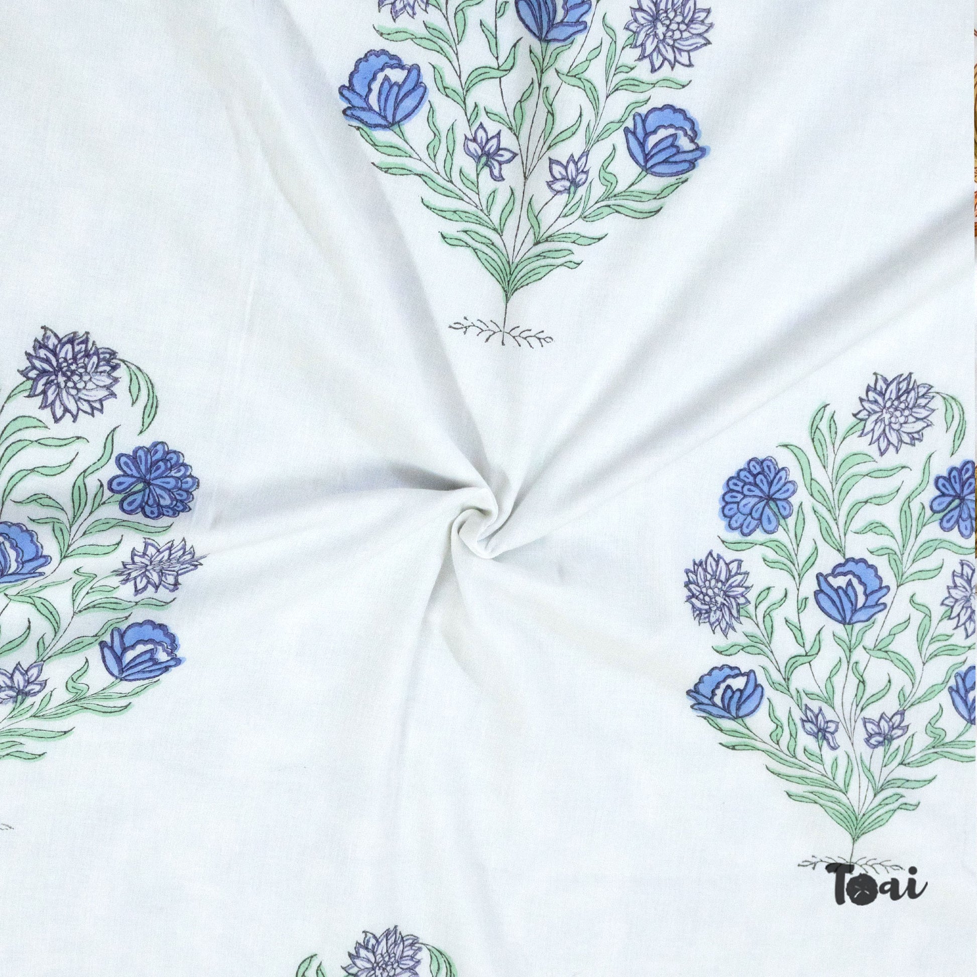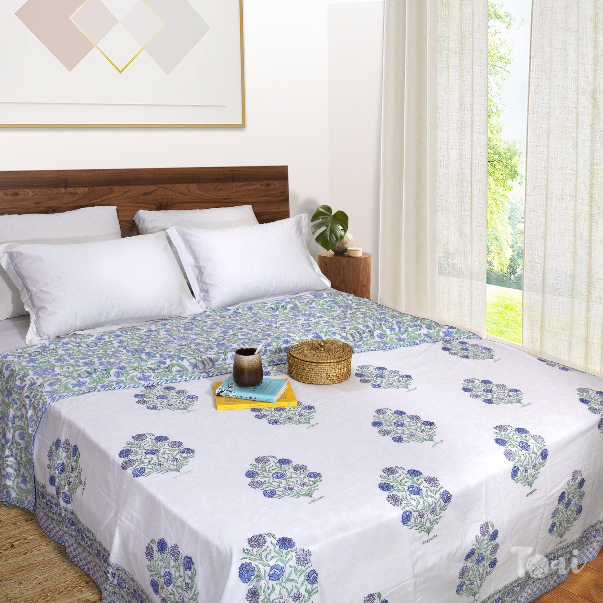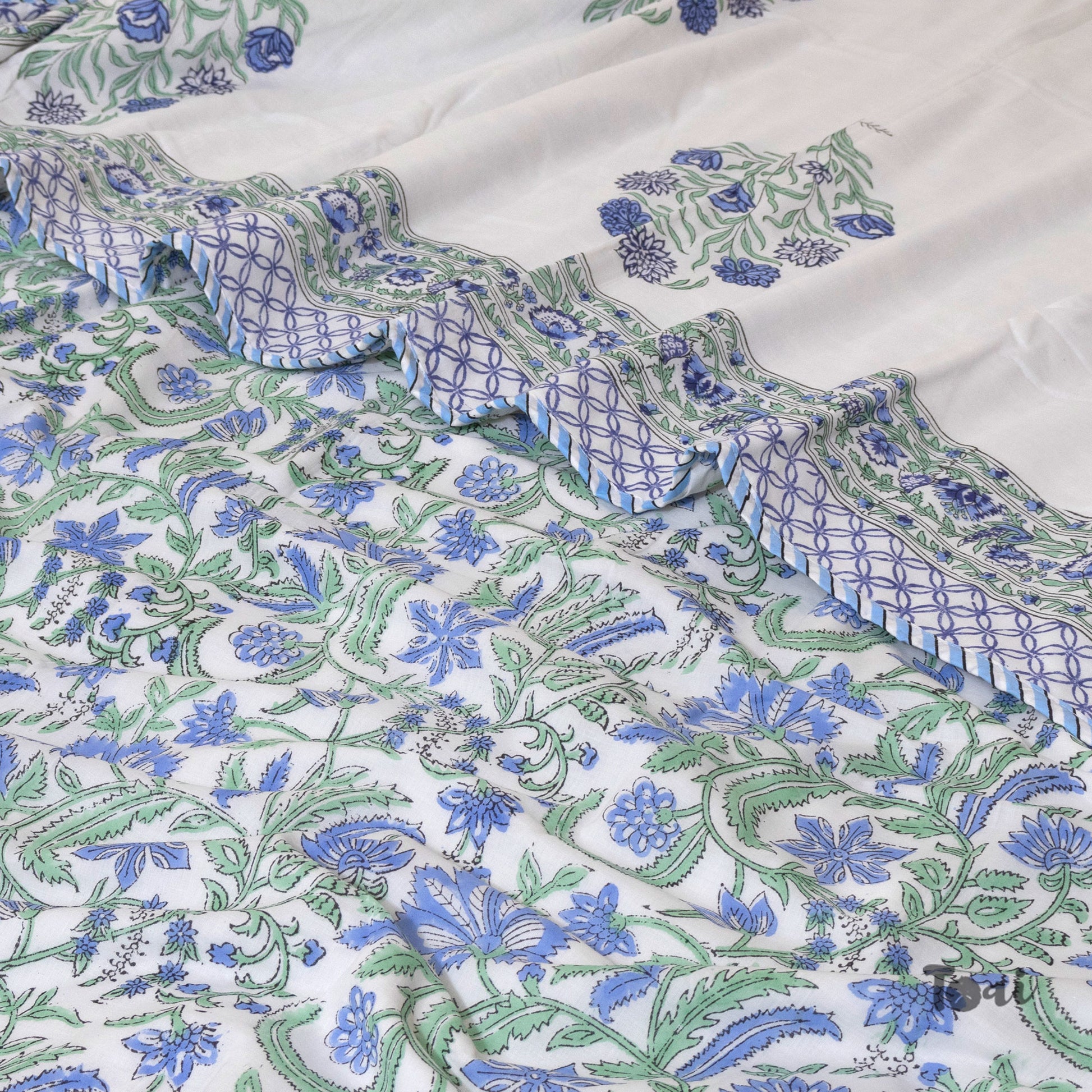 Jaipuri Dohar Hand Block Printed 3 Layers Reversible 100% Mulmul Cotton Flannel Filling | Single 60" X 90" | Queen 90"x108" | King 108"x90" (Mughal Floral, Blue, Green, White)