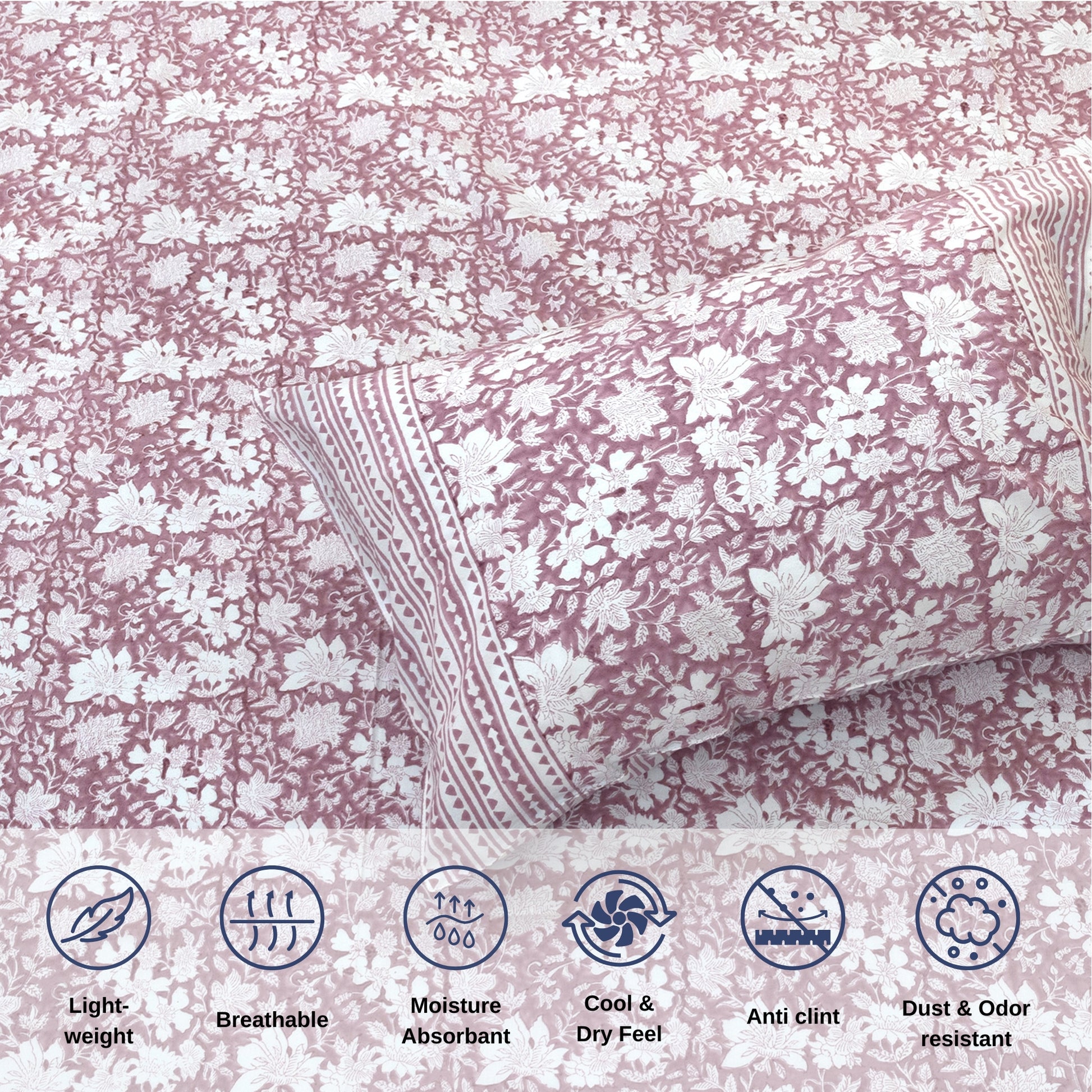 Hand Block Printed Bedsheet | Bed Spread Flatsheet Bed Sheet | Pure Cotton | King 108"x108" | Qeen 90"x108" | Single 60"x90" | 300 TC Pure Cotton | 2 Reversible Pillow Covers |N Pink Kalamkari