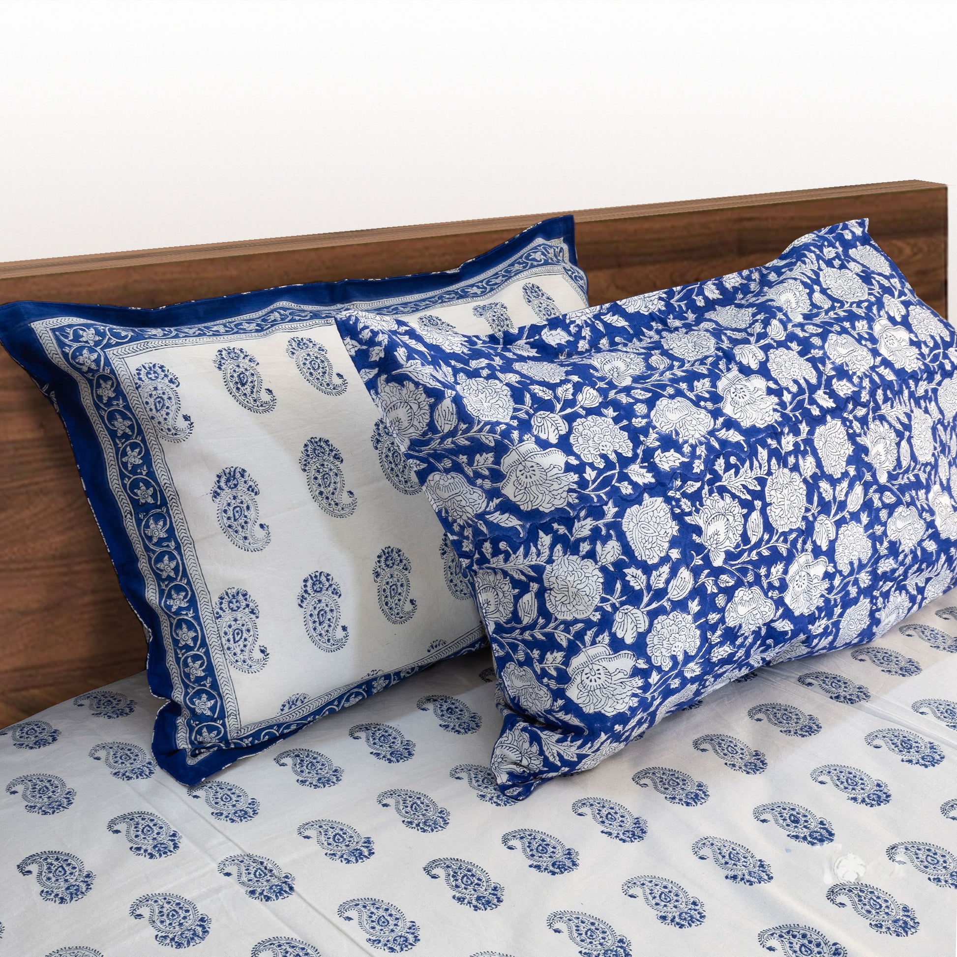 Hand Block Printed Bedsheet | Bed Spread Flat sheet Bed Sheet | Pure Cotton | Queen 90"x108" | King 108"x108" | 2 Reversible Pillow Covers |Blue Paan White
