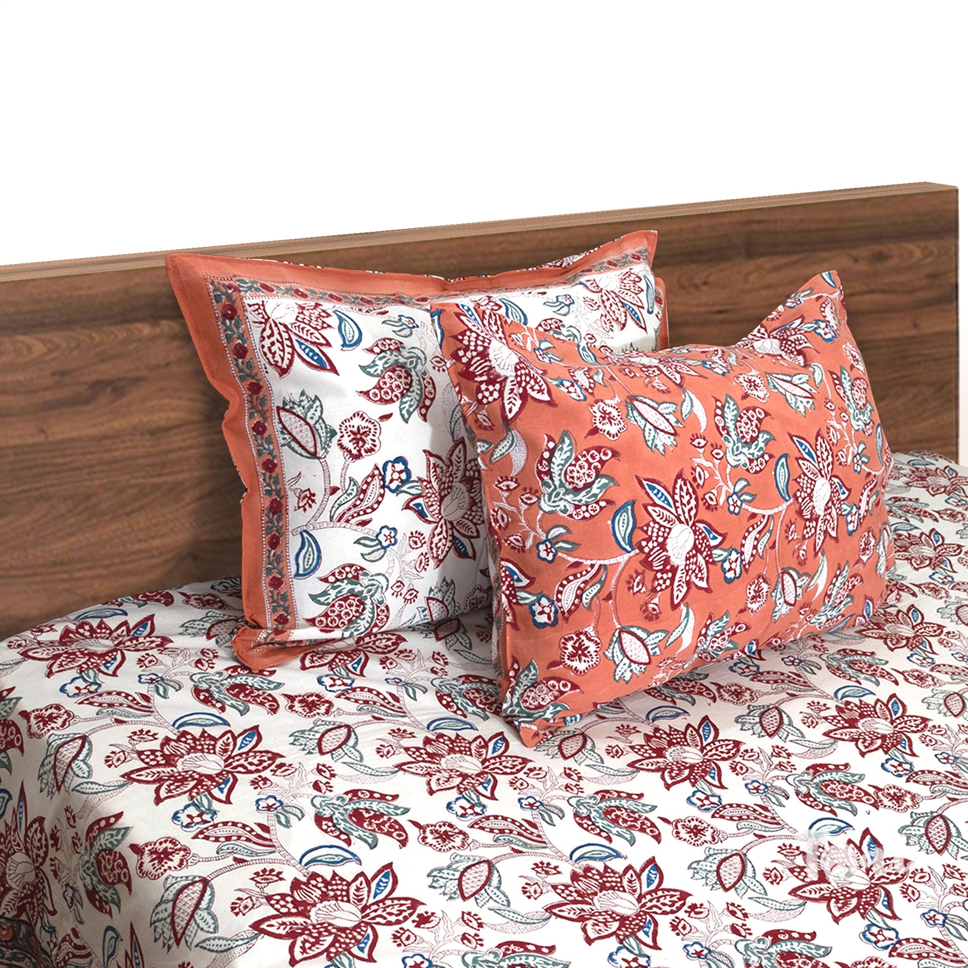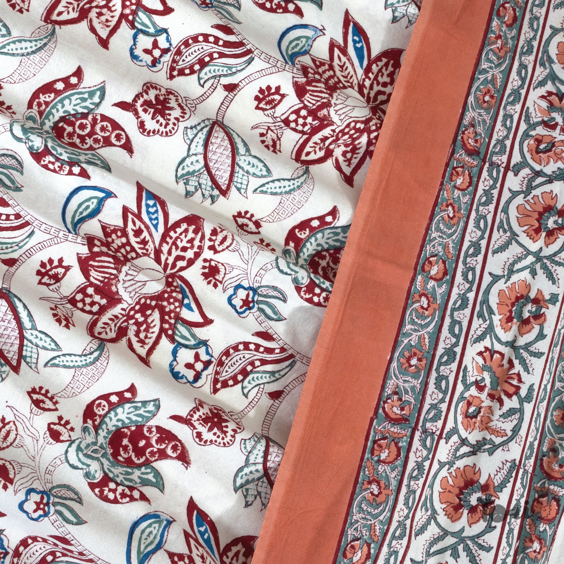 Hand Block Printed Bedsheet | Bed Spread Flatsheet Bed Sheet | Pure Cotton | Queen 90"x108" | King 108"x108" | 2 Reversible Pillow Covers | Peach Florals on White