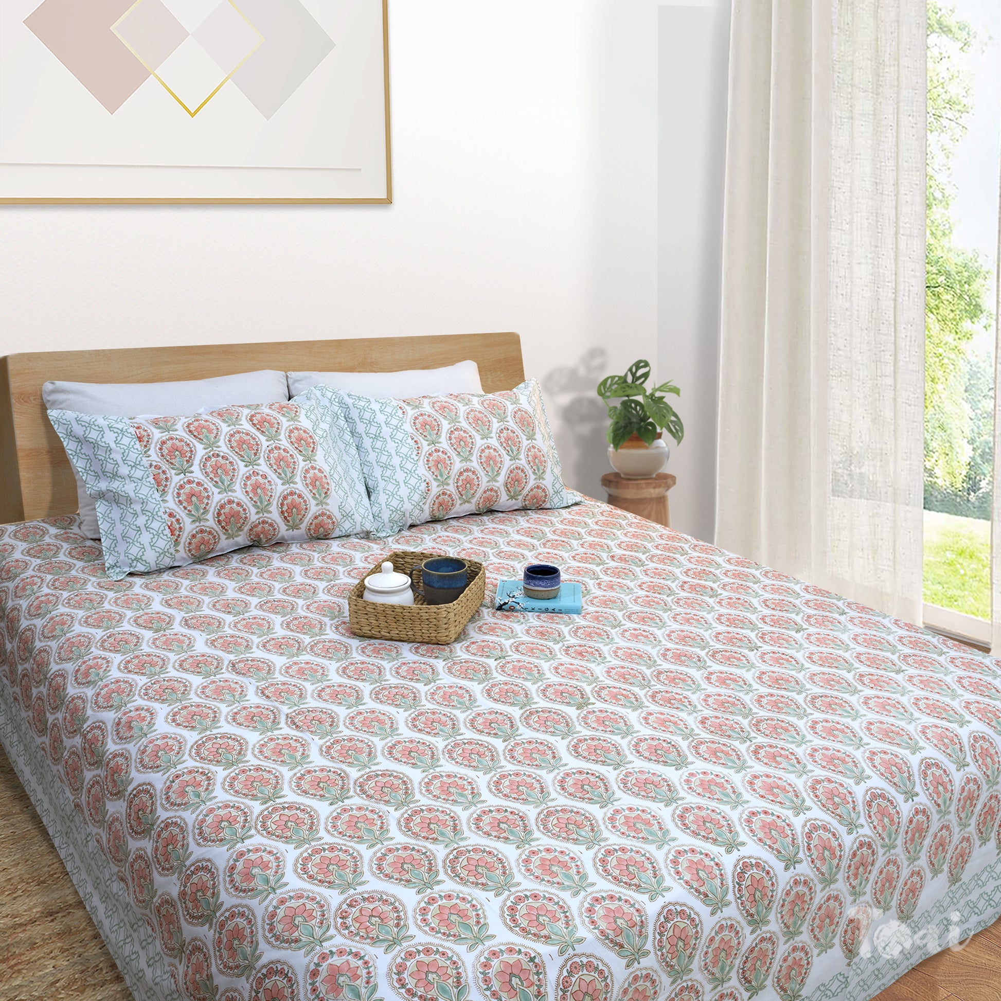 Hand Block Printed Bedsheet | Bed Spread Flat sheet Bed Sheet | Pure Cotton | King 108"x108" | Queen 90"x108" | Single 60"x90" | 300 TC Pure Cotton | 2 Reversible Pillow Covers |Peach Green White