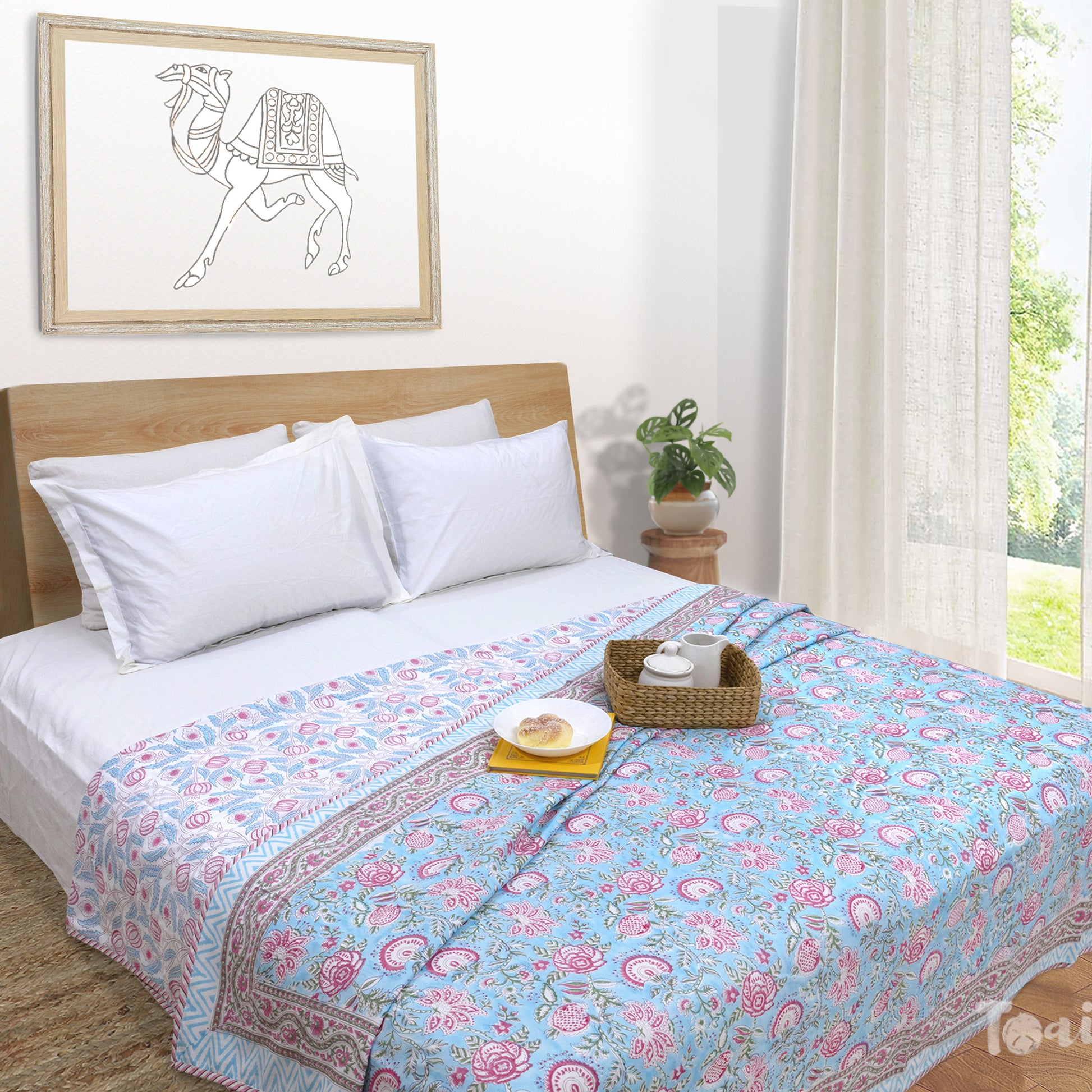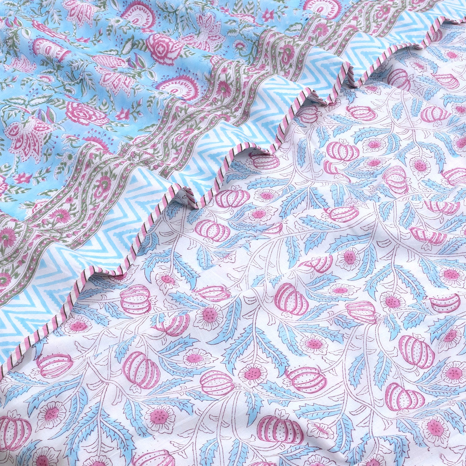 Jaipuri Dohar Hand Block Printed 3 Layers Reversible 100% Mulmul Cotton Flannel Filling | Single 60" X 90" | Queen 90"x108" | King 108"x90" (Pink Florals on Blue )