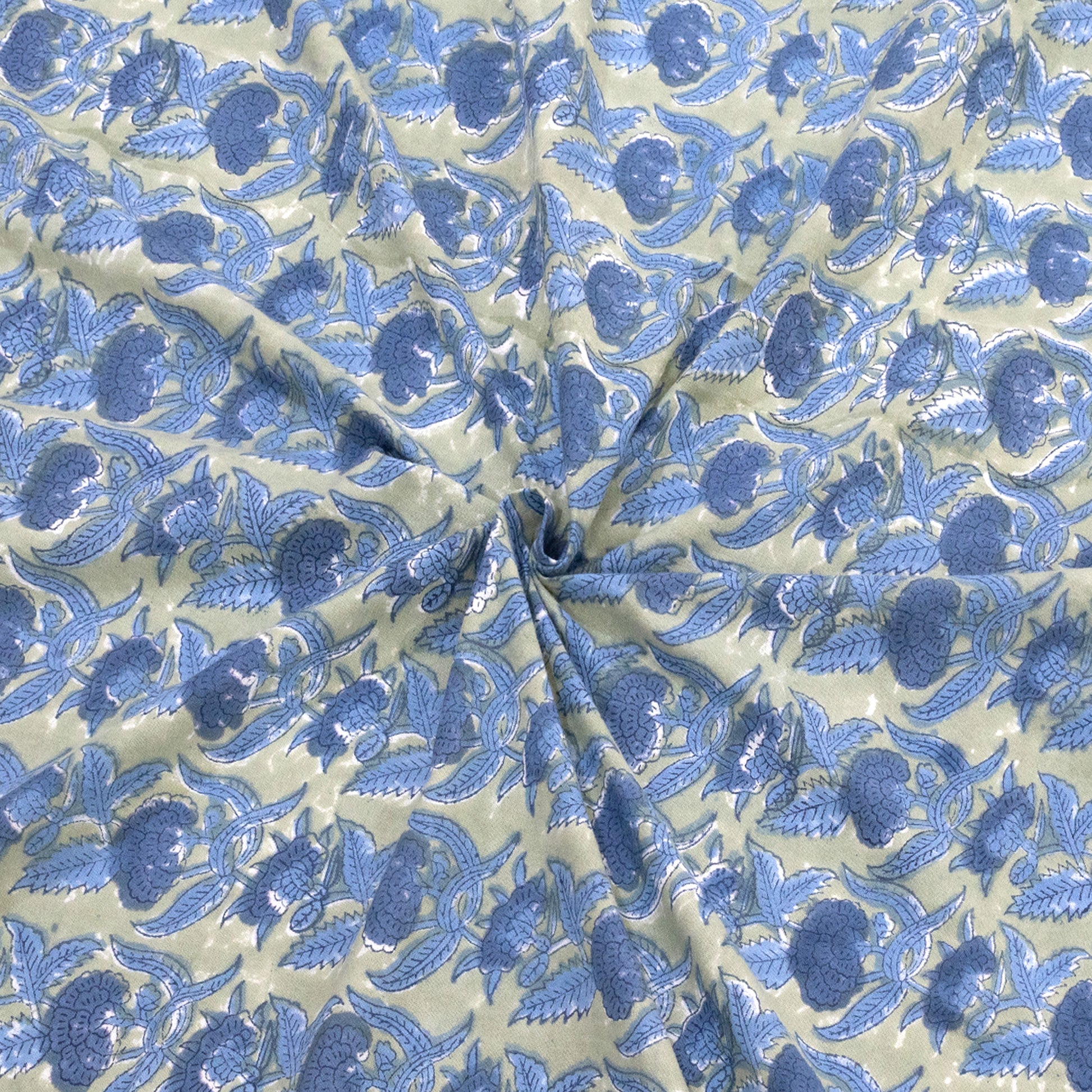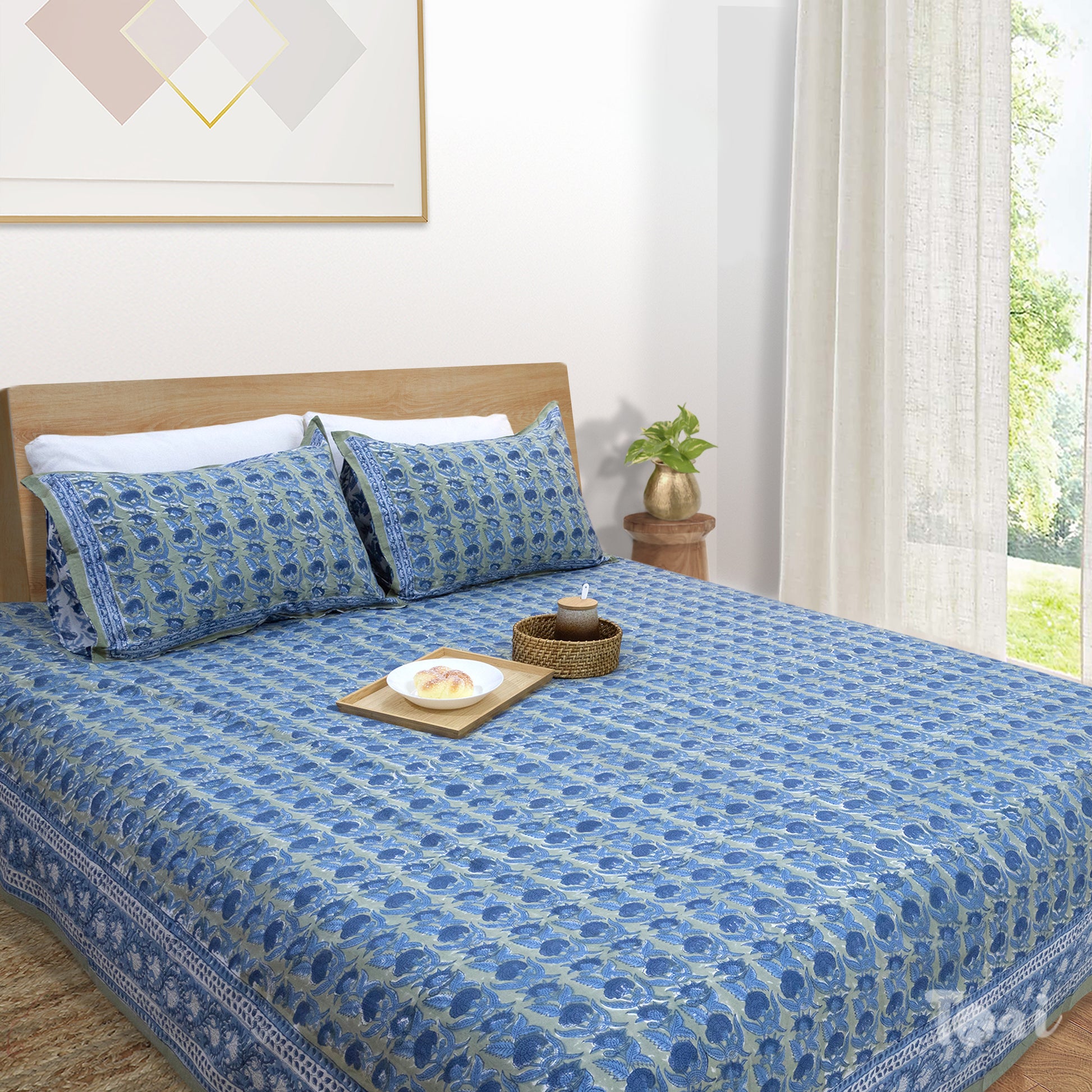 Hand Block Printed Bedsheet | Bed Spread Flatsheet Bed Sheet | Pure Cotton | Queen 90"x108" | King 108"x108" | 2 Reversible Pillow Covers | Sage Green Denim Blue