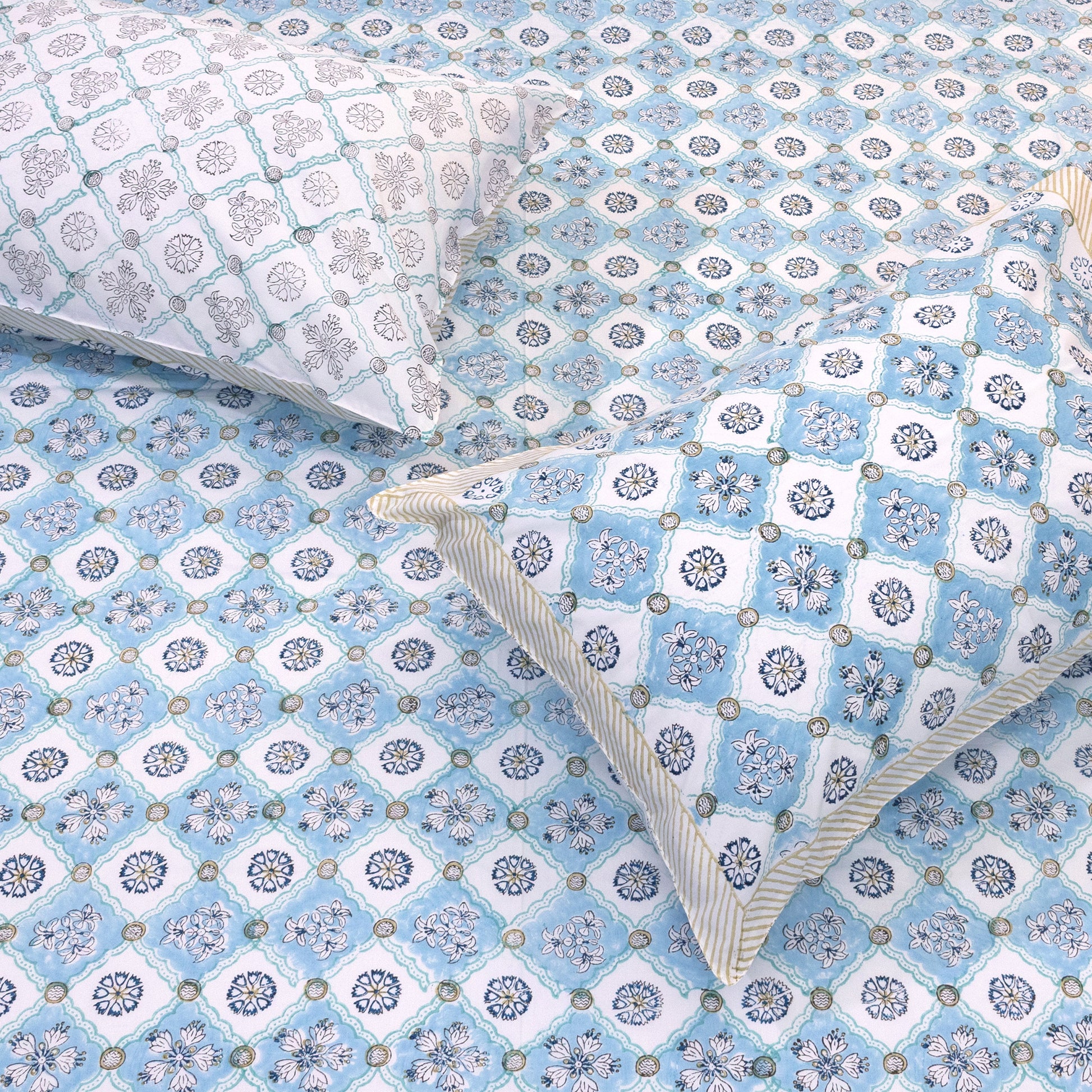Hand Block Printed Bedsheet | Bed Spread Flatsheet Bed Sheet | Pure Cotton | King 108"x108" | Queen 90"x108" | Single 60"x90" | 300 TC Pure Cotton | 2 Reversible Pillow Covers |Small Blue Jaal