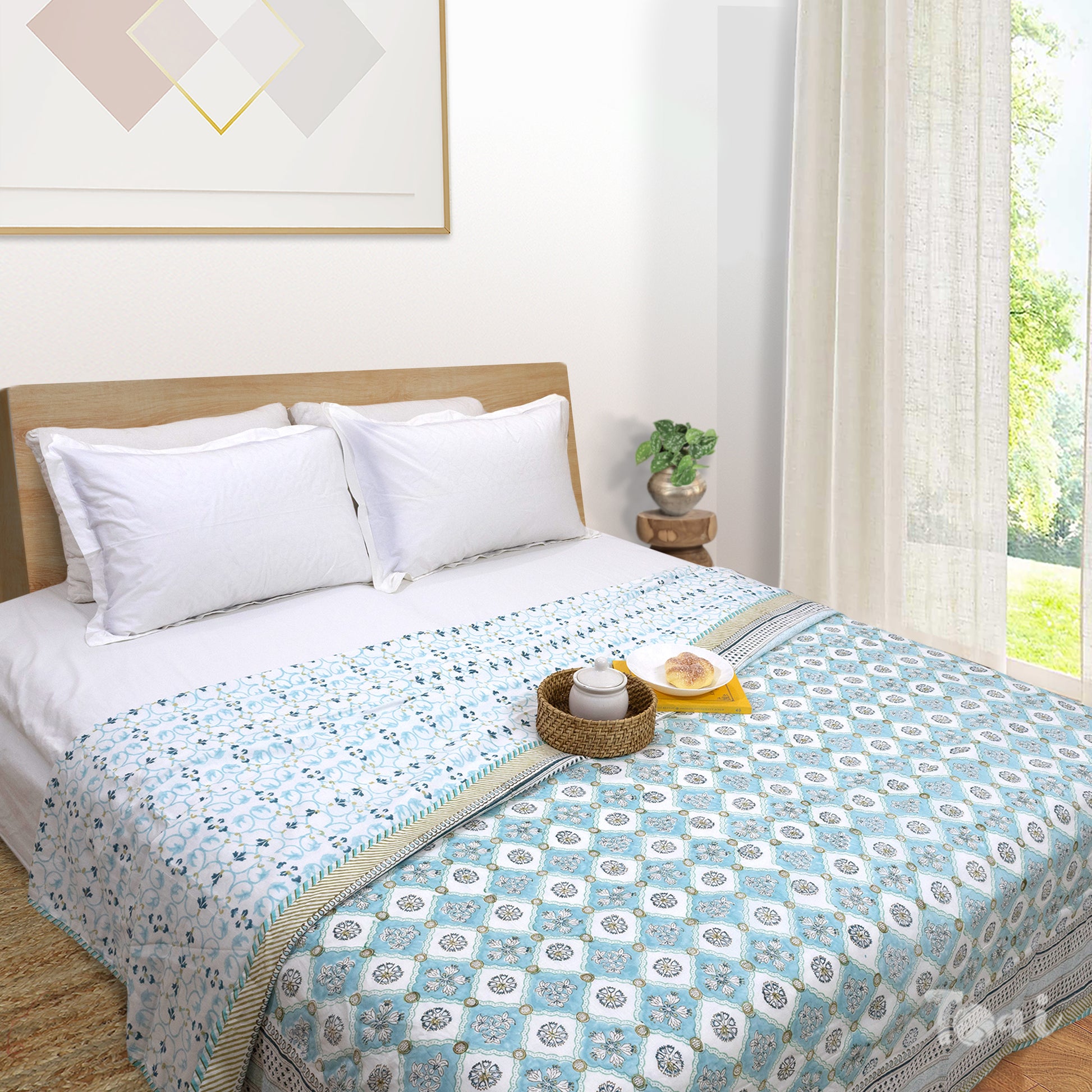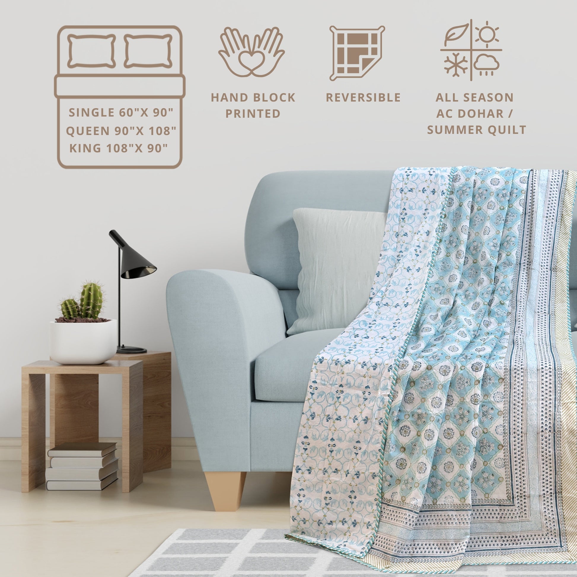 Jaipuri Dohar Hand Block Printed 3 Layers Reversible 100% Mulmul Cotton Flannel Filling | Single 60" X 90" | Queen 90"x108" | King 108"x90" (Small Blue Jaal, White, Blue)