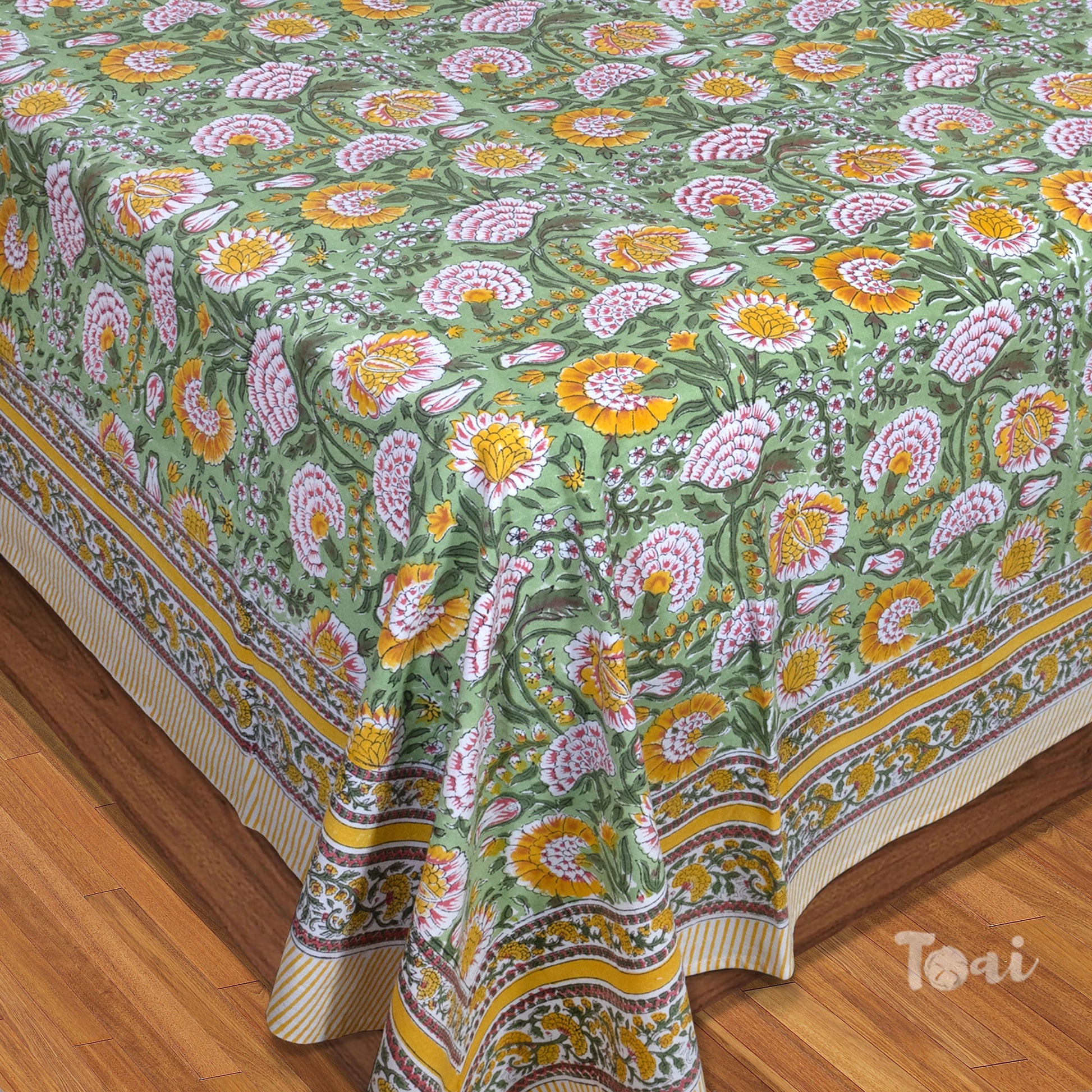Hand Block Printed Bedsheet | Bed Spread Flat sheet Bed Sheet | Pure Cotton | Queen 90"x108" | King 108"x108" | 2 Reversible Pillow Covers |Yellow Pink Florals on Green