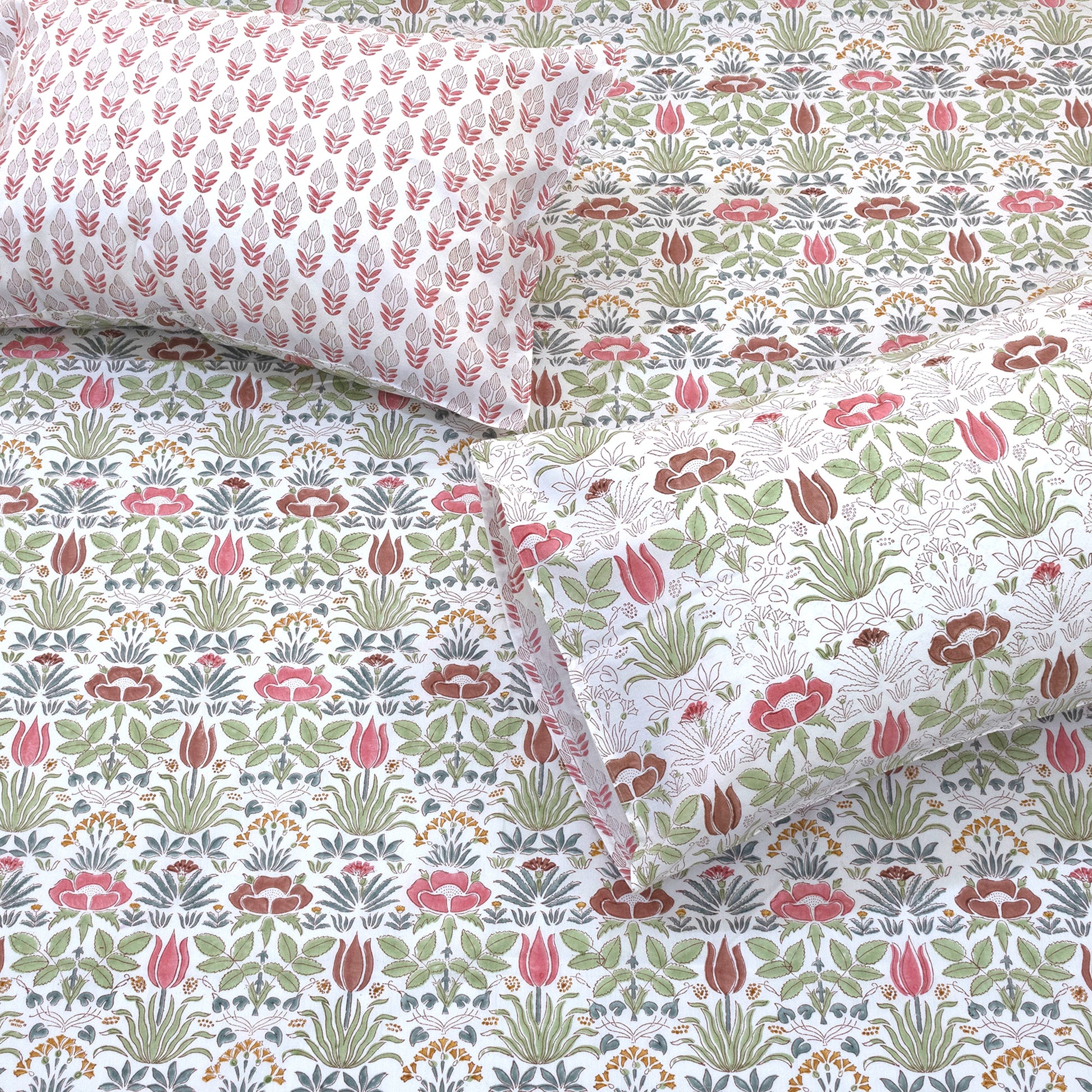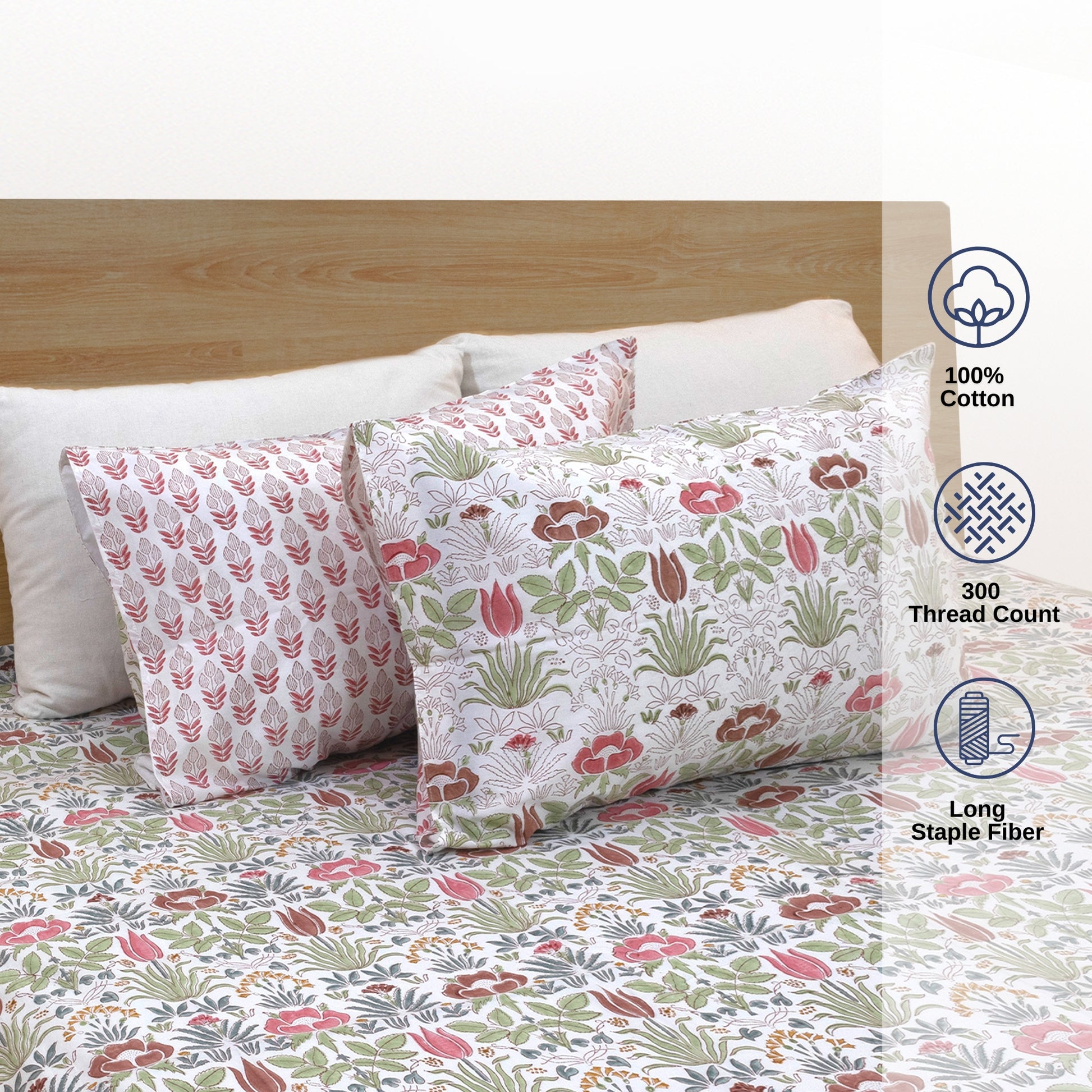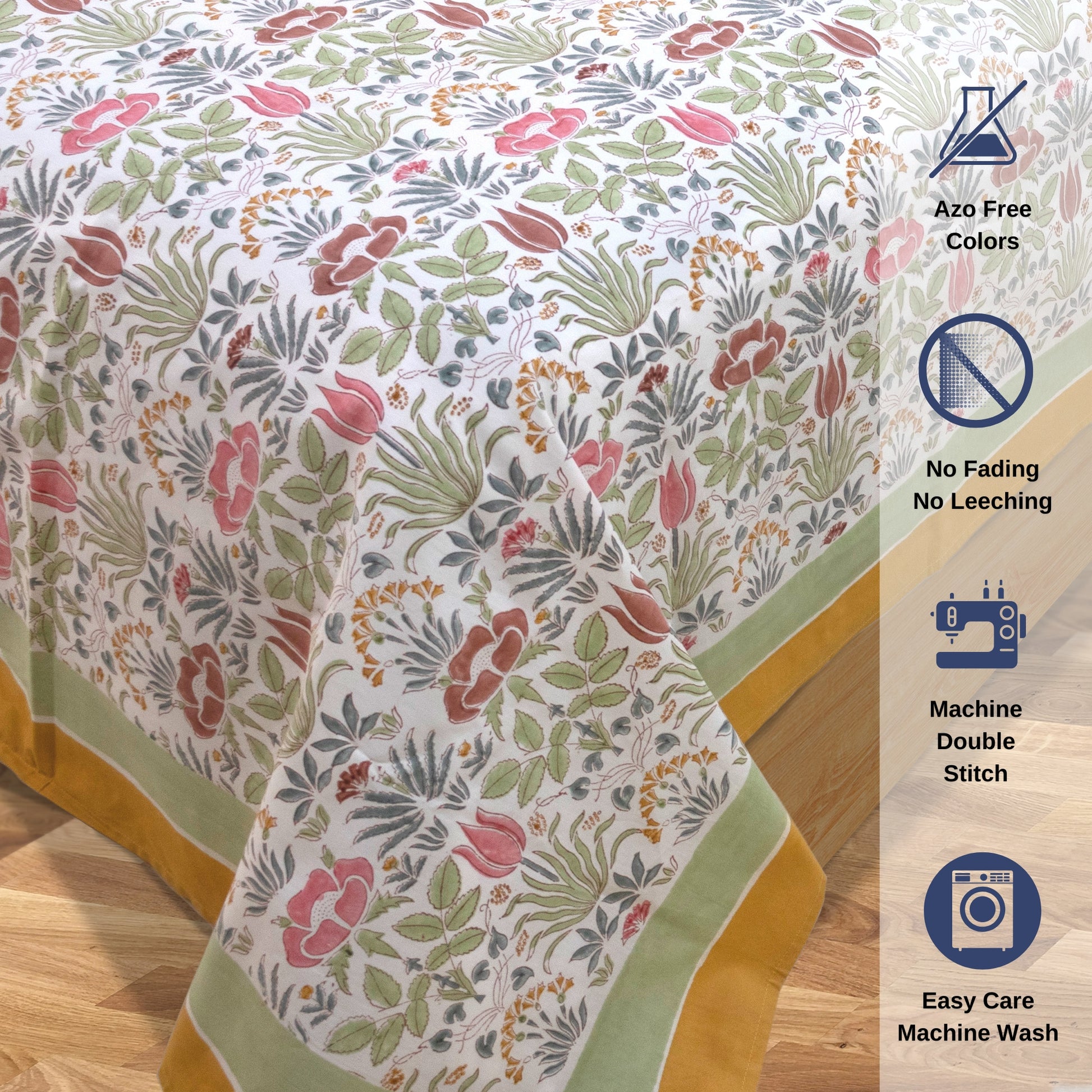Hand Block Printed Bedsheet | Bed Spread Flatsheet Bed Sheet | Pure Cotton | King 108"x108" | Queen 90"x108" | Single 60"x90" | 300 TC Pure Cotton | 2 Reversible Pillow Covers |Spring Florals