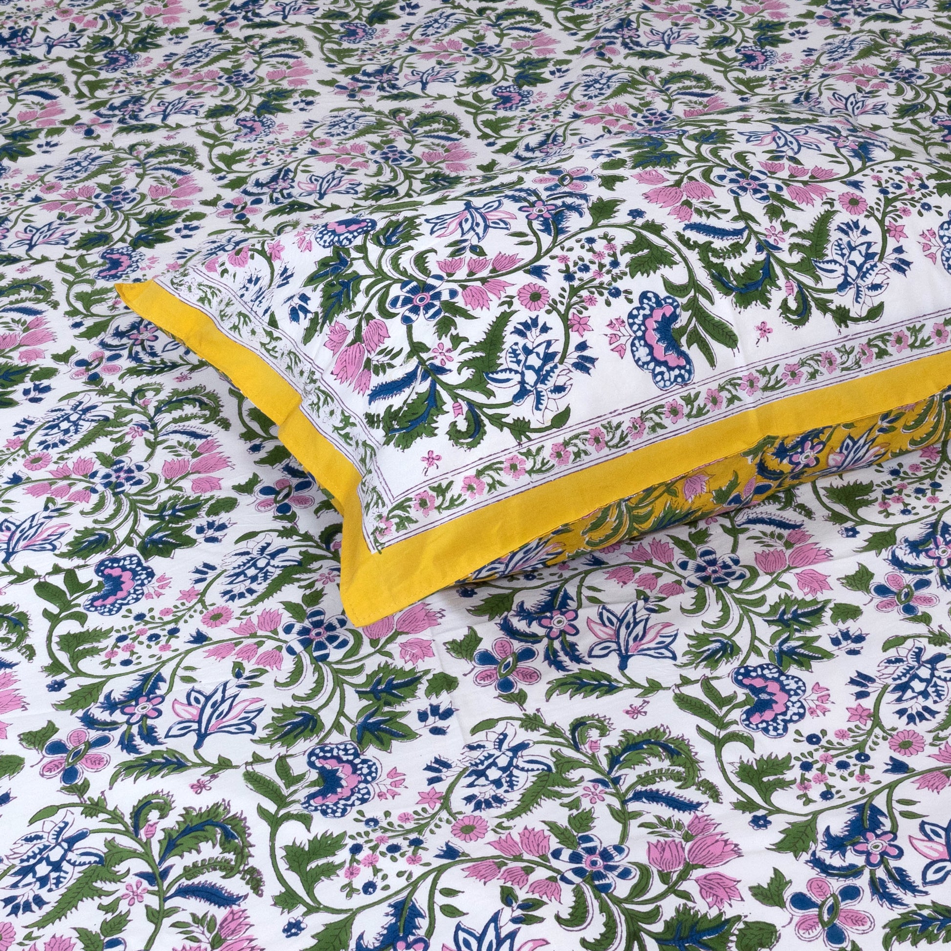 Hand Block Printed Bedsheet | Bed Spread Flatsheet Bed Sheet | Pure Cotton | King 108"x108" | Queen 90"x108" | Single 60"x90" | 300 TC Pure Cotton | 2 Reversible Pillow Covers |Jaipur Floral Print Florals On White