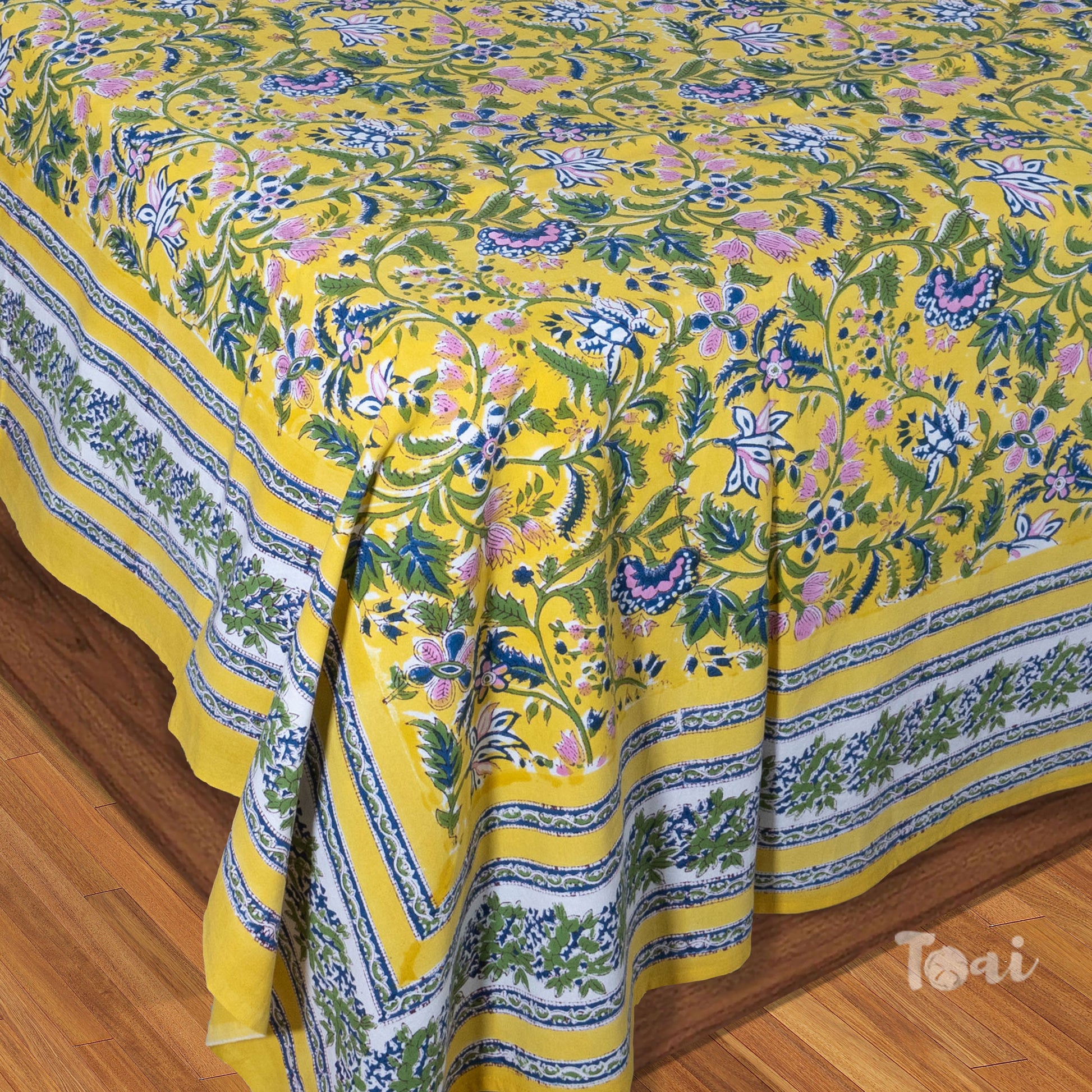 Hand Block Printed Bedsheet | Bed Spread Flat sheet Bed Sheet | Pure Cotton | Queen 90"x108" | King 108"x108" | 2 Reversible Pillow Covers | Yellow Garden