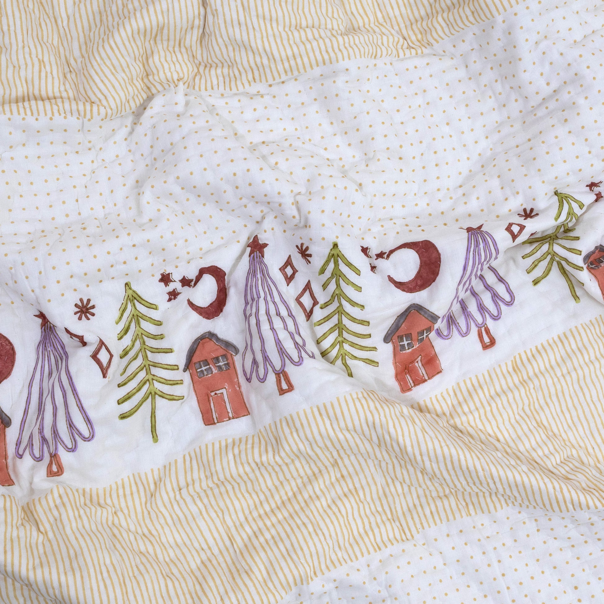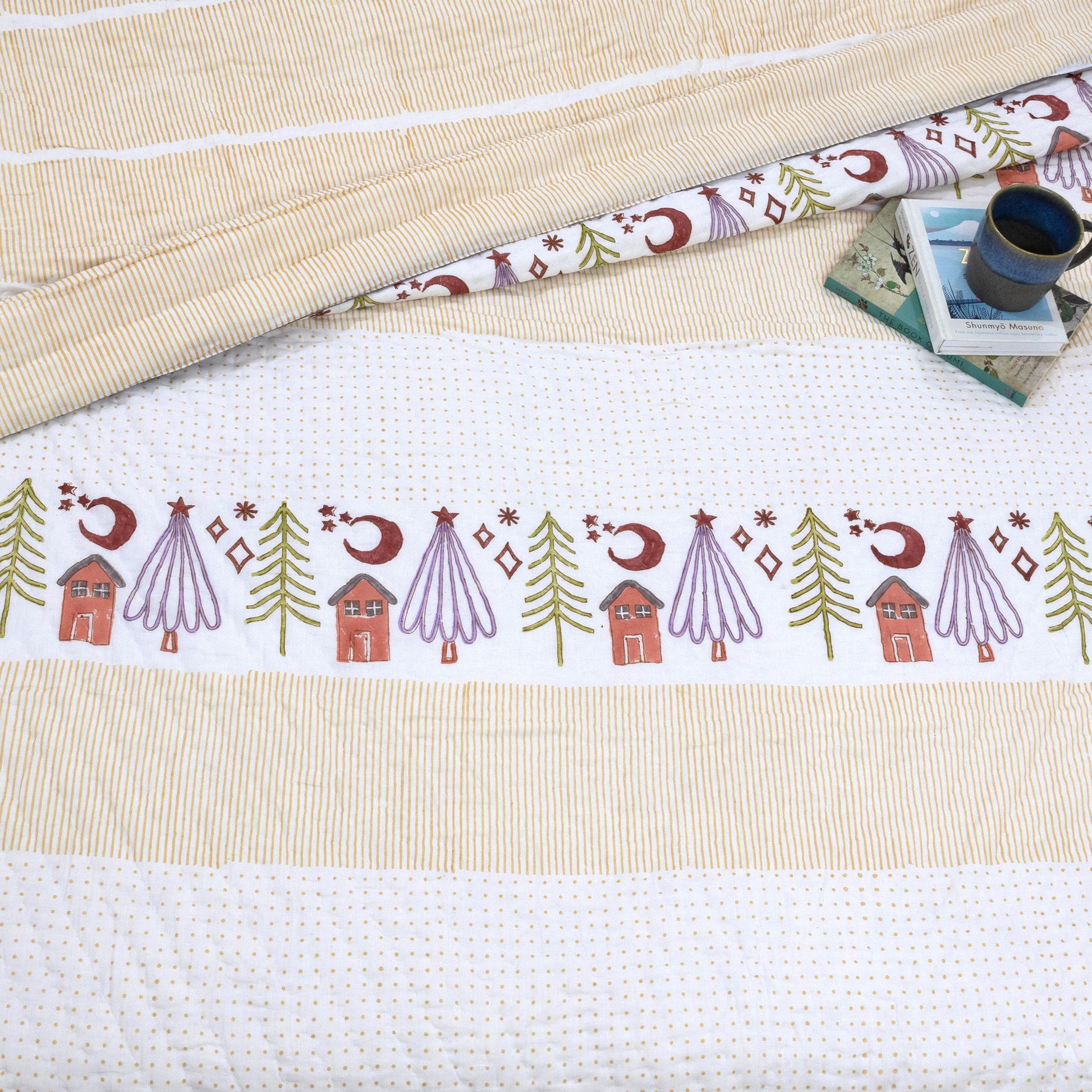 Bedding Set | 300TC Bedsheet with Reversible Pillow Covers and Quilt /Razai | Pure Mercerized Cotton Bedsheet | Pure Mulmul Cotton Comforter with Cotton Wool filling | Block Printed Reversible 3 Layer| Yellow Polka