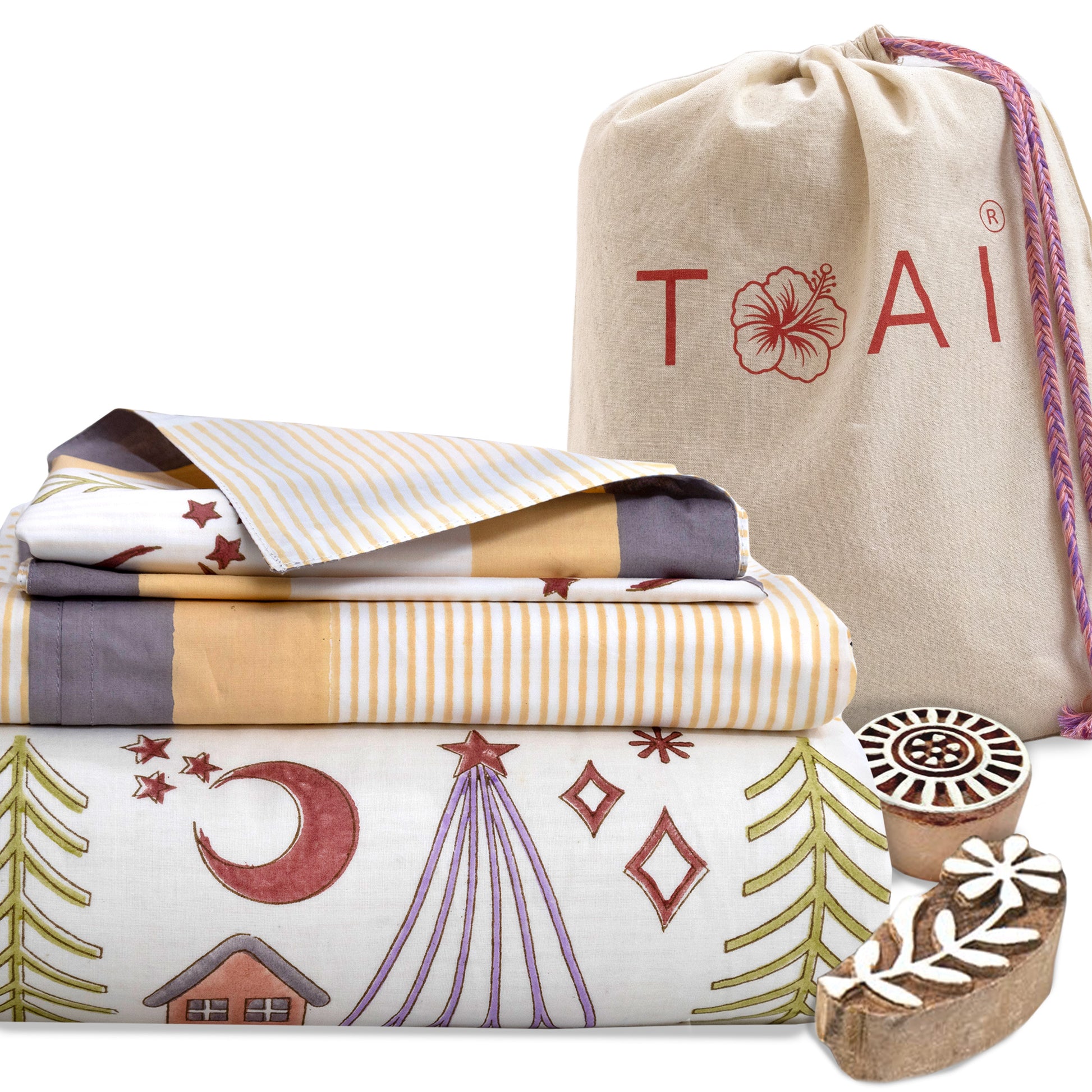 Bedding Set | 300TC Bedsheet with Reversible Pillow Covers and Dohar | Pure Mercerized Cotton Bedsheet | Pure Mulmul Cotton Dohar / Summer Blanket with Falalen filling | Block Printed Reversible 3 Layer| Yellow Polka